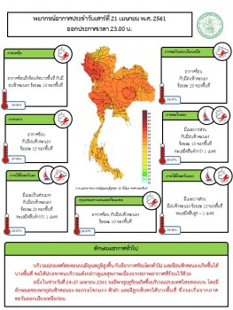 กรมอุตุนิยมวิทยา พยากรณ์อากาศ 24 ชั่วโมงข้างหน้า บริเวณประเทศไทยตอนบน มีอากาศร้อนถึงร้อนจัด และมีฝนฟ้าคะนองเกิดขื้นได้บางพื้นที่ ขอให้ประชาชนบริเวณ ดังกล่าวดูแลสุขภาพเนื่องจากสภาพอากาศที่ร้อนไว้ด้วย สำหรับกรุงเทพฯ และ ปริมณฑล อากาศร้อน กับมีฝนฟ้าคะนอง ร้อยละ 10 ของพื้นที่ อนึ่ง ในช่วงวันที่ 24-27 เมษายน 2561 จะมีพายุฤดูร้อนเกิดขึ้นบริเวณประเทศไทย ตอนบน โดยมีลักษณะของพายุฝนฟ้าคะนอง ลมกระโชกแรง ฟ้าฝ่า และมีลูกเห็บตก ได้บางพื้นที่ ซึ่งจะเริ่มจากภาคตะวันออกเฉียงเหนือก่อน