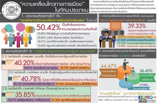 "สวนดุสิตโพล" มหาวิทยาลัยสวนดุสิต เปิดเผยผลสำรวจความคิดเห็นประชาชนทั่วประเทศ จำนวน 1,088 คน ระหว่างวันที่ 18-21 เมษายน 2561 เรื่อง "ความเคลื่อนไหวทางการเมือง ในทัศนะประชาชน" โดยเฉพาะประเด็นการแต่งตั้งนักการเมืองเข้ามาทำงานกับรัฐบาล พล.อ.ประยุทธ์ จันทร์โอชา นายกรัฐมนตรี ซึ่งก่อให้เกิดกระแสวิพากษ์วิจารณ์เรื่องการเมือง อย่างร้อนแรง สรุปผลได้ดังนี้ 1.ประชาชนคิดอย่างไรกับ"กระแสวิพากษ์วิจารณ์เรื่องการเมืองอย่างร้อนแรง" ในขณะนี้ อันดับ 1 เป็นสิทธิของทุกคน สามารถแสดงความคิดเห็นได้ 50.42% อันดับ 2 ประชาชนได้รับรู้ข้อมูล ได้รับฟังความคิดเห็นที่หลากหลายแง่มุม 33.89% อันดับ 3 น่าเบื่อ เป็นเกมการเมือง ทะเลาะ โจมตีกันไปมา 29.69% อันดับ 4 อยากให้มีการเลือกตั้ง ปลดล็อคพรรคการเมือง 18.21% อันดับ 5 รัฐบาลควรรับฟังความคิดเห็น ชี้แจง อธิบายให้เข้าใจตรงกัน 15.69% 2.ประชาชนคิดอย่างไรกับ"การตั้งนักการเมืองเข้ามาทำงานกับรัฐบาล พล.อ.ประยุทธ์" 2.1) กรณีแต่งตั้ง นายสนธยา คุณปลื้ม เป็นที่ปรึกษานายกรัฐมนตรีด้านการเมือง อันดับ 1 รัฐบาลต้องการดึงพรรคการเมืองเข้ามาร่วมทำงาน สร้างแนวร่วม 40.20% อันดับ 2 เป็นเรื่องของผลประโยชน์ทางการเมือง ขยายอำนาจ 33.01% อันดับ 3 ต้องรอดูท่าที และผลงานว่าจะเป็นอย่างไร 28.10% 2.2) กรณีแต่งตั้ง นายอิทธิพล คุณปลื้ม เป็นผู้ช่วยรัฐมนตรีประจำกระทรวงการท่องเที่ยวและกีฬา อันดับ 1 ไม่อยากให้มีเรื่องผลประโยชน์เข้ามาเกี่ยวข้อง 40.78% อันดับ 2 เกิดกระแสวิพากษ์วิจารณ์รัฐบาล ต้องการสร้างฐานเสียง 30.14% อันดับ 3 เป็นคนที่มีประสบการณ์ มีผลงาน ขอให้ตั้งใจทำงาน 29.43% 2.3) กรณีแต่งตั้ง นายสกลธี ภัททิยกุล เป็นรองผู้ว่าราชการ กทม. อันดับ 1 เป็นประเด็นที่ถูกจับตามอง มีความใกล้ชิดกับนายสุเทพ 35.85% อันดับ 2 รอพิสูจน์ผลงาน ควรทำเพื่อประโยชน์ส่วนรวม 33.21% อันดับ 3 เป็นเรื่องการเมือง อยากให้คนรุ่นใหม่เข้ามาทำงาน 31.32% 3. จากความเคลื่อนไหวทางการเมืองที่เกิดขึ้น ประชาชนมอง“ทิศทางการเมืองไทย กับการเลือกตั้งครั้งหน้า” อย่างไร อันดับ 1 มีพรรคการเมืองหลากหลาย น่าจะมีการแข่งขันกันมากขึ้น 39.33% อันดับ 2 อาจเกิดความเคลื่อนไหว ขัดแย้ง วุ่นวาย 28.87% อันดับ 3 อยากให้มีนักการเมืองที่เป็นคนรุ่นใหม่ ไม่ใช่คนกลุ่มเดิมๆ 21.34% อันดับ 4 กำหนดการเลือกตั้งขึ้นอยู่กับการตัดสินใจของรัฐบาล 17.15% อันดับ 5 บรรยากาศทางการเมืองคึกคัก ประชาชนสนใจข่าวการเลือกตั้ง 15.90% 4.ประชาชนคิดว่าสถานการณ์ในขณะนี้สมควรให้อิสระกับพรรคการเมือง (ปลดล็อค) แล้วหรือยัง อันดับ 1 ควรปลดล็อคโดยไม่มีเงื่อนไข 44.47% เพราะ เป็นประชาธิปไตย เกิดความเท่าเทียม พรร