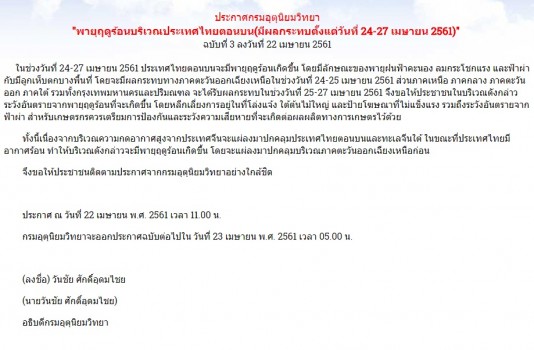 ประกาศกรมอุตุนิยมวิทยา"พายุฤดูร้อนบริเวณประเทศไทยตอนบน(มีผลกระทบตั้งแต่วันที่ 24-27 เมษายน 2561)" ฉบับที่ 3 ระบุว่า ในช่วงวันที่ 24-27 เมษายนนี้ ประเทศไทยตอนบน จะมีพายุฤดูร้อนเกิดขึ้น โดยมีลักษณะของพายุฝนฟ้าคะนอง ลมกระโชกแรง และฟ้าผ่า กับมีลูกเห็บตกบางพื้นที่ โดยจะมีผลกระทบทางภาคตะวันออกเฉียงเหนือในช่วงวันที่ 24-25 เมษายน ส่วนภาคเหนือ ภาคกลาง ภาคตะวันออก ภาคใต้ รวมทั้งกรุงเทพมหานคร และปริมณฑล จะได้รับผลกระทบในช่วงวันที่ 25-27 เมษายน จึงขอให้ประชาชนในบริเวณ ดังกล่าวระวังอันตรายจากพายุฤดูร้อนที่จะเกิดขึ้น โดยหลีกเลี่ยงการอยู่ในที่โล่งแจ้ง ใต้ต้นไม้ใหญ่ และป้ายโฆษณาที่ไม่แข็งแรง รวมถึงระวังอันตรายจากฟ้าผ่า สำหรับเกษตรกรควรเตรียมการป้องกันและระวังความเสียหายที่จะเกิดต่อผลผลิตทางการเกษตรไว้ด้วย ทั้งนี้ เนื่องจากบริเวณความกดอากาศสูงจากประเทศจีนจะแผ่ลงมาปกคลุมประเทศไทย ตอนบนและทะเลจีนใต้ ในขณะที่ประเทศไทยมีอากาศร้อน ทำให้บริเวณดังกล่าวจะมี พายุฤดูร้อนเกิดขึ้น โดยจะแผ่ลงมาปกคลุมบริเวณภาคตะวันออกเฉียงเหนือก่อน จึงขอให้ประชาชนติดตามประกาศจากกรมอุตุนิยมวิทยาอย่างใกล้ชิด