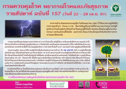 นายแพทย์สุวรรณชัย วัฒนายิ่งเจริญชัย อธิบดีกรมควบคุมโรค กล่าวว่า จากการเฝ้าระวัง ของกรมควบคุมโรค ในเดือนนี้ ได้รับรายงานผู้เสียชีวิตจากการถูกฟ้าผ่า 4 ราย และ จากข้อมูลในช่วงหลายปีที่ผ่านมาพบว่า เหตุการณ์ผู้ที่ถูกฟ้าผ่าส่วนใหญ่มีประวัติถูกฟ้าผ่า ขณะอยู่ใต้ต้นไม้ รองลงมาคือขณะอยู่ในกระท่อมกลางนา และบริเวณที่โล่งแจ้ง และ ส่วนใหญ่จะเกิดในจังหวัดทางภาคตะวันออกเฉียงเหนือ ดังนั้น จากการพยากรณ์โรคและ ภัยสุขภาพประจำสัปดาห์ คาดว่าช่วงนี้อาจมีผู้ได้รับบาดเจ็บและเสียชีวิตจากการถูกฟ้าผ่าได้ เพราะประเทศไทยมีพายุฤดูร้อนเป็นระยะๆ ไปจนถึงเดือน พ.ค. กรมควบคุมโรคขอแนะนำวิธีการปฏิบัติตัว เพื่อป้องกันอันตรายจากฟ้าผ่า คือ กฎ 30/30 ดังนี้ หากอยู่ในที่โล่งแจ้งแล้วเกิดฟ้าแลบ ได้ยินเสียงฟ้าร้องตามมาในเวลาไม่เกิน 30 วินาที แสดงว่าฝนฟ้าคะนองอยู่ใกล้ พอที่เกิดฟ้าผ่าทำอันตรายได้ ให้หาที่หลบที่ปลอดภัยทันที โดยเป็นสิ่งปลูกสร้างที่แข็งแรง และเมื่อพายุฝนฟ้าคะนองหยุดแล้ว ไม่มีเสียงฟ้าร้อง ควรรอในที่หลบอีกอย่างน้อย 30 นาที จึงออกมาได้ เพื่อให้พายุผ่านพ้นไปหรือสลายตัว ไปก่อน แต่หากไม่สามารถหาที่หลบได้ ให้นั่งยองให้ตัวต่ำที่สุดและเท้าชิดกันและ เขย่งปลายเท้า หลีกเลี่ยงการอยู่ใต้ต้นไม้สูงและสิ่งนำไฟที่มีลักษณะสูง เช่น เสาไฟ หรือใกล้ผนังอาคาร หากมีรถยนต์ควรหลบเข้าไปอยู่ในรถ ปิดประตูและกระจกหน้าต่าง ให้สนิท อย่าสัมผัสส่วนที่เป็นโลหะ จะสามารถป้องกันอันตรายจากฟ้าผ่าได้ ส่วนโทรศัพท์มือถือ ถึงแม้ไม่มีหลักฐานชัดเจนว่าเป็นสื่อนำกระแสไฟฟ้า แต่หากกระแส ไฟฟ้าจากฟ้าผ่าเข้ามาในโทรศัพท์มือถือก็อาจทำให้ไฟฟ้าลัดวงจรและเป็นอันตราย ต่อผู้ใช้งานได้ ดังนั้น จึงควรปิดโทรศัพท์ไร้สาย รวมถึงอุปกรณ์เครื่องใช้ไฟฟ้าและ อิเล็กทรอนิกส์ขณะเกิดพายุ หากมีข้อสงสัยสอบถามได้ที่สายด่วน1422