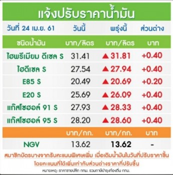 บริษัท ปตท. จำกัด (มหาชน) และบริษัทบางจากคอร์ปอเรชั่น จำกัด (มหาชน) ปรับขึ้น ราคาขายปลีกน้ำมันทุกชนิดลิตรละ 40 สตางค์ ยกเว้น E85 ปรับขึ้น 20 สตางค์ มีผล ตั้งแต่เวลา 05.00 น. วันพรุ่งนี้ (25 เม.ย.) เป็นต้นไป ทั้งนี้ จะส่งผลให้ราคาน้ำมันหน้าสถานีบริการน้ำมันของ ปตท.ในเขตกรุงเทพมหานคร และปริมณฑลวันพรุ่งนี้ เป็นดังนี้ เบนซิน 95 ของ ปตท. ลิตรละ 35.66 บาท, แก๊สโซฮอล์ 95 ลิตรละ 28.55 บาท, แก๊สโซฮอล์ 91 ลิตรละ 28.28 บาท, E20 ลิตรละ 26.04 บาท, E85 อยู่ที่ลิตรละ 20.64 บาท และดีเซล ลิตรละ 27.89 บาท ราคานี้ยังไม่รวมภาษี ท้องที่ของแต่ละจังหวัด