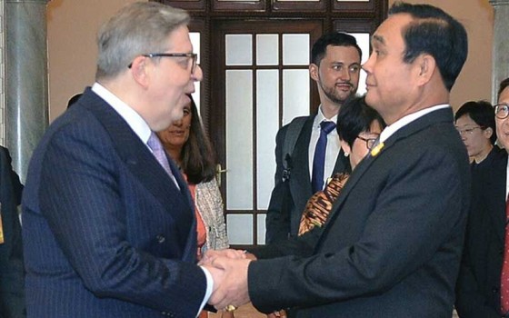 ที่ห้องสีงาช้าง ตึกไทยคู่ฟ้า ทำเนียบรัฐบาล นายปีร์กะ ตาปีโอละ เอกอัครราชทูต วิสามัญผู้มีอำนาจเต็มแห่งสหภาพยุโรปประจำประเทศไทย เข้าเยี่ยมคารวะ พลเอก ประยุทธ์ จันทร์โอชา นายกรัฐมนตรี ในโอกาสเข้ารับหน้าที่ โดยนายกรัฐมนตรีกล่าวชื่นชมเอกอัครราชทูตสหภาพยุโรปประจำประเทศไทย ที่ปฏิบัติหน้าที่อย่างแข็งขัน นับตั้งแต่เดินทางถึงประเทศไทยเมื่อต้นเดือน ก.ย. ที่ผ่านมา และมีส่วนสำคัญในการผลักดันให้ฟื้นฟูความสัมพันธ์ไทย-สหภาพยุโรป หรือ อียู โดยเฉพาะอย่างยิ่งการปรับข้อมติเกี่ยวกับประเทศไทย ทำให้ความร่วมมือ ระหว่าง 2 ฝ่ายในด้านต่างๆกลับมามีพัฒนาการอีกครั้ง รวมทั้งในปลายปีนี้ ยังได้ตอบรับ เข้าร่วมการประชุมผู้นำเอเชีย-ยุโรป หรือ อาเซม ที่กรุงบรัสเซลส์ ประเทศเบลเยียมด้วย สำหรับพัฒนาการทางการเมืองของไทยนั้น นายกรัฐมนตรี ขอให้อียู ไว้วางใจว่า รัฐบาลไทยยังเดินหน้าตามโรดแมป และกรอบระยะเวลาของกฎหมาย นอกจากนี้ จะให้มีการเลือกตั้งทั่วไปเพื่อนำไทยกลับสู่ประชาธิปไตยอย่างยั่งยืน ขณะที่เอกอัครราชทูตอียู แสดงยินดีที่ทั้ง 2 ฝ่ายมีปฏิสัมพันธ์ระหว่างกันมากขึ้น หลังจากการปรับข้อมติเกี่ยวกับไทย และเชื่อว่าไทย-อียู ยังมีศักยภาพที่จะกระชับ ความร่วมมือในมิติต่างๆในอนาคต ทั้งการแลกเปลี่ยนการเยือนระดับสูงและ การร่วมหารือของคณะทำงานในสาขาต่างๆ นอกจากนี้ เอกอัครราชทูตอียู ชื่นชมนายกรัฐมนตรีที่แสดงเจตนารมณ์ทางการเมือง อย่างชัดเจน รวมถึงสั่งการให้แก้ปัญหาการทำประมงผิดกฎหมายและปัญหาแรงงาน ซึ่งอียู เข้าใจดีว่าปัญหาเหล่านี้มีความซับซ้อน เชื่อว่าไทยจะเดินหน้าแก้ไขปัญหาดังกล่าว เพื่อสร้างความยั่งยืนได้