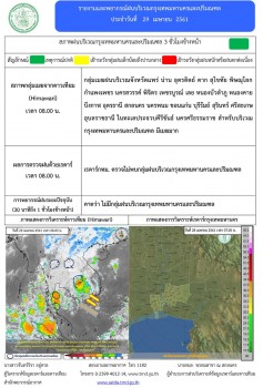 พยากรณ์อากาศ 24 ชั่วโมงข้างหน้า บริเวณภาคเหนือ ภาคตะวันออกเฉียงเหนือ ภาคตะวันออก ภาคกลาง กรุงเทพมหานครและปริมณฑล และภาคใต้ มีฝนฟ้าคะนอง และมีฝนตกหนักบางพื้นที่ ขอให้ประชาชนบริเวณดังกล่าวระวังอันตรายจากฝนฟ้าคะนอง และฝนตกหนักในระยะนี้ไว้ด้วย ทั้งนี้ คลื่นกระแสลมตะวันตกเคลื่อนเข้าปกคลุมภาคเหนือและประเทศลาว ประกอบกับมีลมตะวันออกเฉียงใต้พัดปกคลุม ภาคตะวันออกเฉียงเหนือ ภาคกลาง และภาคตะวันออก ขณะที่หย่อมความกดอากาศต่ำกำลังแรง ยังคงปกคลุมทะเลอันดามันตอนบน ทำให้บริเวณประเทศไทยมีฝนฟ้าคะนองเกิดขึ้นหลายพื้นที่ กับมีฝนตกหนักบางแห่ง - ภาคเหนือ ภาคตะวันออกเฉียงเหนือ ภาคใต้ทั้งสองฝั่ง มีเมฆมาก กับมีฝนฟ้าคะนอง ร้อยละ 60 ของพื้นที่ และมีฝนตกหนักบางแห่ง - ภาคกลาง ภาคตะวันออก มีเมฆมาก กับมีฝนฟ้าคะนอง ร้อยละ 70 ของพื้นที่ และมีฝนตกหนักบางแห่ง - กรุงเทพมหานครและปริมณฑล มีเมฆมาก กับมีฝนฟ้าคะนอง ร้อยละ 80 ของพื้นที่ และมีฝนตกหนักบางแห่ง อุณหภูมิต่ำสุด 23-25 องศาเซลเซียส สูงสุด 26-27 องศาฯ
