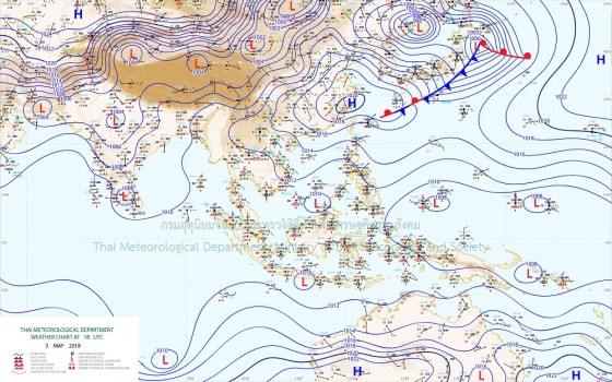พยากรณ์อากาศ 24 ชั่วโมงข้างหน้า บริเวณภาคเหนือและภาคตะวันออกเฉียงเหนือ มีฝนตกหนักบางพื้นที่ สำหรับภาคกลาง ภาคตะวันออก และภาคใต้ ยังคงมีฝนฟ้าคะนองเกิดขึ้นได้ ขอให้ประชาชนบริเวณภาคเหนือและภาคตะวันออกเฉียงเหนือ ระวังอันตรายจากฝนตกหนักและฝนที่ตกสะสมไว้ด้วย - ภาคเหนือ ภาคตะวันออกเฉียงเหนือ มีฝนฟ้าคะนอง ร้อยละ 70 ของพื้นที่ และมีฝนตกหนักบางแห่ง - ภาคกลาง ภาคตะวันออก กรุงเทพมหานครและปริมณฑล มีเมฆมาก กับมีฝนฟ้าคะนอง ร้อยละ 60 - ภาคใต้ (ฝั่งตะวันออก) มีฝนฟ้าคะนอง ร้อยละ 40 - ภาคใต้ (ฝั่งตะวันตก) มีฝนฟ้าคะนอง ร้อยละ 30 ของพื้นที่