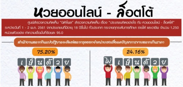 ศูนย์สำรวจความคิดเห็น นิด้าโพล สถาบันบัณฑิตพัฒนบริหารศาสตร์ เปิดเผยผลสำรวจความคิดเห็นประชาชน เรื่อง “คนไทยคิดอย่างไร กับ หวยออนไลน์ - ล็อตโต้” สำรวจระหว่างวันที่ 1-2 พ.ค. รวม 1,250 หน่วยตัวอย่าง ประชาชนที่ตอบแบบสอบถามส่วนใหญ่ ร้อยละ 75.20 ระบุว่า เห็นด้วย กรณีสำนักงานสลากกินแบ่งรัฐบาล จะจัดพิมพ์สลากเลขชุดออกจำหน่ายเอง เพื่อลดปัญหาการขายสลากเกินราคา เพราะจะได้ซื้อได้ในราคาที่กำหนดแน่นอน สามารถควบคุมราคาได้ ลดปัญหาพ่อค้าคนกลางและการเอาเปรียบผู้บริโภค ขณะที่ ร้อยละ 24.16 ไม่เห็นด้วย เพราะไม่อยากให้มีการขายเลขชุด ไม่สามารถแก้ปัญหาได้ เป็นการแก้ปัญหาไม่ตรงจุด และบางส่วนระบุว่า น่าจะมีวิธีการจัดการกับพ่อค้าคนกลางมากกว่าการจัดพิมพ์จำหน่ายเอง และทำให้พ่อค้าแม่ค้ารายได้ลดลง ส่วนที่สำนักงานสลากกินแบ่งฯ จะเพิ่มการขาย “หวยออนไลน์” ประชาชนส่วนใหญ่ ร้อยละ 67.68 เห็นด้วย เพราะสะดวก หาซื้อง่าย ถูกต้องตามกฎหมาย ง่ายต่อการควบคุมราคาและยังช่วยลดปัญหาการขายสลากเกินราคา ขณะที่ร้อยละ 30.72 ไม่เห็นด้วย เพราะมีขั้นตอนค่อนข้างซับซ้อน เข้าถึงได้ยาก ไม่สะดวก และสามารถโกงได้ง่าย บางส่วนระบุ อยากให้ขายสลากกินแบ่งรัฐบาลเพียงอย่างเดียว เพื่อลดการสร้างหนี้ของประชาชน ประชาชนส่วนใหญ่ ร้อยละ 53.68 ยังเห็นด้วยที่จะเพิ่มการขาย “หวยล็อตโต้” เพราะสะดวกซื้อ ง่ายในการควบคุมราคา เป็นการเพิ่มช่องทางเลือก มีโอกาสในการถูกรางวัลค่อนข้างสูง และได้ซื้อเลขที่ชอบ รองลงมา ร้อยละ 38.08 ไม่เห็นด้วย เพราะค่อนข้างยุ่งยากและวุ่นวาย มีตัวเลือกมากไป ทำให้ประชาชนงมงายมากขึ้น ขณะที่บางส่วนอยากให้ขายสลากกินแบ่งรัฐบาลเพียงอย่างเดียว สำหรับการเพิ่มบทลงโทษผู้ที่ขายสลากเกินราคา จากเดิมโทษปรับไม่เกิน 2,000 บาท เปลี่ยนเป็น จำคุกไม่เกิน 1 เดือน ปรับไม่เกิน 10,000 บาท หรือทั้งจำทั้งปรับ จะสามารถแก้ไขปัญหาการขายสลากเกินราคาได้หรือไม่ พบว่า ประชาชนส่วนใหญ่ ร้อยละ 55.36 ระบุแก้ไขไม่ได้ เพราะยังไม่รุนแรงพอ การบังคับใช้กฎหมายไม่จริงจัง ทำให้ไม่มีความเกรงกลัวกฎหมายบางส่วนระบุว่า เป็นการแก้ปัญหาที่ปลายเหตุ ไม่ตรงจุด และร้อยละ 43.60 ระบุว่าแก้ไขได้ เพราะเพิ่มบทลงโทษ ทำให้เกิดความเกรงกลัวกฎหมาย ไม่กล้ากระทำผิด ขณะที่บางส่วนระบุว่า อยากให้มีการบังคับใช้บทลงโทษอย่างจริงจัง