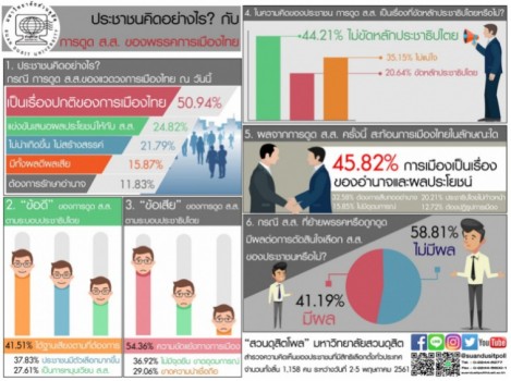 “สวนดุสิตโพล” มหาวิทยาลัยสวนดุสิต เปิดเผยผลสำรวจความคิดเห็นประชาชนที่มีสิทธิเลือกตั้งทั่วประเทศ 1,158 คน ระหว่างวันที่ 2-5 พฤษภาคม หัวข้อ “ประชาชนคิดอย่างไร? กับ การดูด ส.ส.ของพรรคการเมืองไทย” พบว่า อันดับ 1 เป็นเรื่องปกติของการเมืองไทย ที่ผ่านมาก็เคยเกิดขึ้น 50.94% อันดับ 2 แต่ละพรรคมีการแข่งขันกัน เสนอผลประโยชน์ให้แก่ ส.ส. 24.82% อันดับ 3 ไม่น่าเกิดขึ้น ไม่สร้างสรรค์ ทำให้การเมืองไม่พัฒนา 21.79% สำหรับ “ข้อดี” ของการดูด ส.ส. ตามระบอบประชาธิปไตย อันดับ 1 พรรคการเมืองได้จำนวน ส.ส. เพิ่มมากขึ้น ได้ฐานเสียงตามที่ต้องการ 41.51% อันดับ 2 เกิดการแข่งขัน มีความหลากหลาย ประชาชนมีตัวเลือกมากขึ้น 37.83% อันดับ 3 เป็นการหมุนเวียน ส.ส. ทำให้พรรคมีคนเก่งมากขึ้น 27.61% ส่วน “ข้อเสีย” ของการดูด ส.ส. ตามระบอบประชาธิปไตย อันดับ 1 เกิดความขัดแย้งทางการเมือง ทะเลาะเบาะแว้ง โจมตีกัน 54.36% อันดับ 2 การเมืองไม่เข้มแข็ง ไม่มีจุดยืน ขาดอุดมการณ์ 36.92% อันดับ 3 ขาดความน่าเชื่อถือ ภาพลักษณ์ไม่ดี 29.06% ในความคิดของประชาชน การดูด ส.ส. เป็นเรื่องที่ขัดหลักประชาธิปไตยหรือไม่? อันดับ 1 ไม่ขัดหลักประชาธิปไตย 44.21% เพราะเป็นเรื่องที่มีมานาน เคยเกิดขึ้นทุกครั้งที่มีการเลือกตั้ง นักการเมืองมีสิทธิจะเลือก เป็นความสมัครใจ ฯลฯ อันดับ 2 ไม่แน่ใจ 35.15% เพราะต้องดูว่าผิดกฎหมายหรือไม่ ไม่รู้ข้อมูลข้อเท็จจริง มีทั้งข้อดีข้อเสีย ต้องพิจารณาหลายด้าน ฯลฯ อันดับ 3 ขัดหลักประชาธิปไตย 20.64% เพราะไม่ควรทำ เป็นการใช้อำนาจในทางที่ไม่เหมาะสม ควรแข่งขันอย่างเป็นธรรมเท่าเทียม ส่วนผลจากการดูด ส.ส.ครั้งนี้ สะท้อนการเมืองไทยในลักษณะใด อันดับ 1 การเมืองเป็นเรื่องของอำนาจและผลประโยชน์ 45.82% อันดับ 2 เห็นแก่ประโยชน์ของตนเอง ต้องการสืบทอดอำนาจ 32.58% อันดับ 3 การเมืองไม่พัฒนา เหมือนอดีตที่ผ่านมา ประชาธิปไตยไม่ก้าวหน้า 20.21% สำหรับการที่ ส.ส.ย้ายพรรคหรือถูกดูด มีผลต่อการตัดสินใจเลือก ส.ส.ของประชาชนหรือไม่? อันดับ 1 ไม่มีผล 58.81% เพราะดูที่ตัวบุคคล เลือกจากพรรคที่ชอบ สามารถพิจารณาตัดสินใจเองได้ ดูจากประวัติ ผลงานที่ผ่านมา ฯลฯ อันดับ 2 มีผล 41.19% เพราะต้องพิจารณาตัดสินใจ เกิดความลังเล ไม่แน่ใจ รู้สึกไม่เชื่อมั่นในตัว ส.ส. ที่ย้าย ทำให้เบื่อหน่าย ฯลฯ
