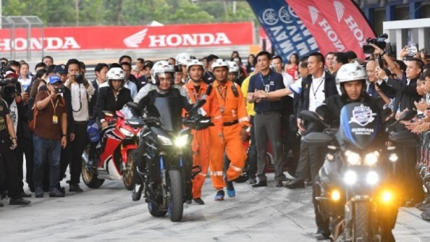 พล.อ.ประยุทธ์ จันทร์โอชา นายกรัฐมนตรี พร้อมนายเนวิน ชิดชอบ อดีตแกนนำพรรค ภูมิใจไทย เดินทางมายังสนามช้าง อินเตอร์เนชั่นแนล เซอร์กิต เพื่อตรวจเยี่ยมความพร้อม ของประเทศไทยในการเป็นเจ้าภาพจัดการแข่งขันจักรยานยนต์ชิงแชมป์โลก สนามที่ 15 รายการ PTT Thailand Grand Prix เมื่อนายกรัฐมนตรี มาถึง ได้เยี่ยมชมนิทรรศการเกี่ยวกับรถจักรยานยนต์และการแข่งขัน ของสนามต่าง ๆ รวมทั้งให้กำลังใจผู้สนับสนุนและเยาวชนผู้ที่เข้าร่วมแข่งขันและผู้ฝึกหัด จากนั้น นายกรัฐมนตรี เปลี่ยนสวมชุดเซฟตี้สำหรับการขับขี่รถจักรยานยนต์ หรือชุดนักแข่ง รถมอเตอร์ไซด์ และขับขี่รถ ร่วมกับนายเนวิน ชิดชอบ 2 รอบสนาม และลงมาขอบคุณเจ้าหน้าที่และผู้เกี่ยวข้องทุกคน จากนั้น นายเนวิน นำหมวกกันน็อกลายไทย มอบให้นายกรัฐมนตรี พร้อมกล่าวว่า ขอให้ท่านนายก ฯ ปลอดภัยจากสื่อและนักการเมือง สำหรับหมวกของตนไม่แข็งแรงเท่านี้ เพราะไม่ต้องไปยุ่งกับสื่อและนักการเมือง จากนั้น พล.อ.ประยุทธ์ นำหมวกกันน็อคมาใส่ พร้อมให้สื่อมวลชนถ่ายรูป ก่อนที่จะทำท่า ตั้งการ์ดขึ้นป้องกัน และก่อนกลับ นายกรัฐมนตรี ถ่ายรูปเป็นที่ระลึกกับบรรดานักแข่ง ทั้งสองทีม และมอบลายเซ็นบนหมวกเพื่อเป็นที่ระลึกให้เจ้าหน้าที่สนามด้วย