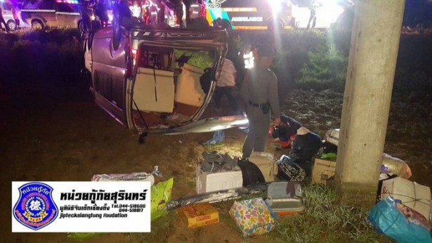เหตุเกิดที่ถนนสาย 226 สุรินทร์-ศรีสะเกษ หลัก กม.ที่ 18-19 บ้านกันจารย์ ต.เมืองที อ.เมืองสุรินทร์ เมื่อกลางดึกที่ผ่านมา ตำรวจ สภ.เมืองที พร้อมด้วยศูนย์แพทย์ฉุกเฉิน 1669 โรงพยาบาลสุรินทร์ และอาสากู้ภัยสุรินทร์ เข้าตรวจสอบจุดเกิดเหตุ พบรถตู้โดยสาร ทะเบียน 80-0906 กรุงเทพมหานคร เสียหลักพลิกคว่ำตกข้างทางลักษณะหงายท้องล้อชี้ฟ้า ภายในรถพบผู้ได้รับบาดเจ็บเล็กน้อย 13 คน และอีก 3 คนไม่ได้รับบาดเจ็บ ทีมฉุกเฉินและอาสากู้ภัย ช่วยกันนำผู้บาดเจ็บส่งโรงพยาบาลสุรินทร์ อย่างไรก็ตาม ห่างจากรถตู้ไปประมาณ 100 เมตร พบศพ นายจิรพงษ์ รุ่งเรือง อายุ 40 ปี ผู้โดยสาร ที่กระเด็นออกจากตัวรถ สภาพศีรษะมีบาดแผลลึกและคอหัก จากการสอบสวน นายทวิษ เคนบุปผา อายุ 39 ปี ชาว ต.ม่องใหญ่ อ.เขมราฐ จ.อุบลราชธานี คนขับรถตู้ ให้การว่า เดินทางออกมาจากรุงเทพฯ ตั้งแต่เวลา 17.00 น.เย็นวานนี้ พร้อมผู้โดยสาร 17 คน ปลายทางอยู่ที่ จ.อุบลราชธานี เมื่อถึงที่เกิดเหตุ รู้สึกรถกำลังจะเสียหลักตกถนน จึงหักพวงมาลัย ทำให้รถเสียหลักพลิกคว่ำ หลังเกิดเหตุพบว่าผู้โดยสารได้รับบาดเจ็บ และมีผู้เสียชีวิต จึงรีบโทรศัพท์แจ้งขอความช่วยเหลือจากตำรวจ และศูนย์ช่วยเหลือฉุกเฉินโรงพยาบาลสุรินทร์