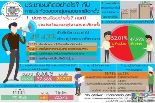 สวนดุสิตโพล มหาวิทยาลัยสวนดุสิต สำรวจความคิดเห็นของประชาชนจากทั่วประเทศ 1,163 คน จากกรณีการประท้วงของกลุ่มคนอยากเลือกตั้ง โดยมีข้อเรียกร้องให้รัฐบาล เร่งจัดการเลือกตั้งภายในปีนี้ และจะจัดชุมนุมใหญ่ขึ้นอีกครั้งในวันที่ 22 พฤษภาคมนี้ พบว่าประชาชนส่วนใหญ่ร้อยละ 49.43 เห็นว่าการประท้วงเป็นสิทธิสามารถทำได้ แต่ต้อง อยู่ในขอบเขตที่เหมาะสม รองลงมา ร้อยละ 24.33 มองว่าเป็นการเรียกร้องอยากให้มีการ เลือกตั้งโดยเร็ว ,ร้อยละ 22.43 ระบุว่า ต้องไม่สร้างความวุ่นวาย ความเดือดร้อนให้กับผู้อื่น ร้อยละ 16.35 มองว่าเป็นความต้องการประท้วงรัฐบาลที่ต้องการสืบทอดอำนาจ และ ร้อยละ 12.55 ระบุว่า เป็นความเคลื่อนไหวที่มีออกมาให้เห็นเป็นระยะ ขอให้ทุกคนใจเย็น มีสติ ไม่วู่วาม ส่วนข้อเรียกร้องที่อยากให้มีการเลือกตั้งในปีนี้ ประชาชนส่วนใหญ่ร้อยละ 37.66 คิดว่า เป็นไปไม่ได้ เพราะนายกรัฐมนตรีประกาศแล้วว่าจะมีการเลือกตั้งในปีหน้า ยังมีการแก้ไข กฎหมายอยู่ และยังไม่ได้ปลดล็อกพรรคการเมือง อาจเตรียมการเลือกตั้งไม่ทัน ขณะที่ ร้อยละ 33.71 ระบุ ไม่แน่ใจ เพราะขึ้นอยู่กับสถานการณ์ ต้องรอดูผลการเจรจา ซึ่งยังไม่รู้ว่า ผลจะออกมาเป็นอย่างไร และร้อยละ 28.63 เชื่อว่าเป็นไปได้ เพราะมีการประท้วงเป็นระยะ สร้างความกดดันต่อรัฐบาล ประชาชนอยากให้มีการเลือกตั้งโดยเร็ว และนายกรัฐมนตรี เคยประกาศว่าจะมีเลือกตั้งในปีนี้ สำหรับการประท้วงครั้งนี้ ประชาชนส่วนใหญ่ ร้อยละ 43.94 เชื่อว่าจะไม่ก่อให้เกิดความวุ่นวาย เพราะรัฐบาลควบคุมสถานการณ์ได้ มีเจ้าหน้าที่คอยควบคุมดูแล เป็นการเคลื่อนไหวเรียกร้อง ที่ไม่รุนแรง และอยู่ในพื้นที่ที่กำหนด ร้อยละ 34.05 ไม่แน่ใจ เพราะยังไม่เกิดขึ้น ยังไม่รู้ความ เคลื่อนไหว อาจเกิดเหตุหรือไม่ก็ได้ ต้องดูสถานการณ์ก่อน และร้อยละ 22.01 คิดว่าจะเกิด ความวุ่นวาย เพราะอาจมีผู้ไม่หวังดีมือที่ 3 เข้ามาสร้างสถานการณ์ เป็นประเด็นที่กำลัง ร้อนแรง อาจเกิดการโจมตีกันไปมา สำหรับความในใจที่ประชาชนอยากบอกผู้ประท้วง ส่วนใหญ่ร้อยละ 55.78 ระบุ อยากให้ ชุมนุมอย่างสงบ อยู่ในขอบเขต มีสติ ,ร้อยละ 31.16 ระบุ อยากให้เห็นแก่ส่วนรวม ไม่ตกเป็น เครื่องมือของฝ่ายใดฝ่ายหนึ่ง และร้อยละ 21.61 ระบุ ควรใช้วิธีการเจรจา ยื่นหนังสือ ส่งตัวแทนพูดคุย ส่วนความในใจที่ประชาชนอยากบอก พล.อ.ประยุทธ์ ในฐานะนายกรัฐมนตรีและ หัวหน้า คสช. ร้อยละ 44.35 ระบุ อยากให้ฟังเสียงของประชาชน เปิดกว้าง ให้อิสระ ทางความคิด รองลงมาร้อยละ 34.35 อยากให้กำหนดการเลือกตั้งให้ชัดเจน ทำตาม โรดแมปที่ประกาศไว้ และร้อยละ 27.39 อยากให้