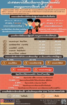 ศูนย์สำรวจความคิดเห็น สถาบันบัณฑิตพัฒนบริหารศาสตร์ หรือ นิด้าโพล ผลสำรวจ ความคิดเห็นของประชาชนจากทั่วประเทศ จำนวน 1,250 คน เรื่อง "ประชาชนอยากได้ใคร เป็นนายกรัฐมนตรีคนต่อไป ตามกฎหมายการเลือกตั้งปัจจุบัน (ครั้งที่ 2)" พบว่าประชาชน ส่วนใหญ่ร้อยละ 57.52 ระบุว่า พรรคการเมืองพรรคใหม่ ๆ เพราะอยากเห็นคนใหม่ๆ นโยบายใหม่ๆ แนวคิดใหม่ๆ เข้ามาบริหารและพัฒนาประเทศไปในทิศทางที่ดีขึ้น ร้อยละ 37.36 ระบุว่า พรรคการเมืองพรรคเก่า เพราะมีประสบการณ์ ทำงานอย่าง มีระบบ เคยเห็นผลงานมาแล้ว มั่นใจในผลงาน มีความคุ้นเคยกับประชาชนเป็นอย่างดี เข้าใจและสามารถแก้ไขปัญหาได้ดีกว่าพรรคการเมืองพรรคใหม่ และร้อยละ 5.12 ระบุว่า ไม่ระบุ/ไม่แน่ใจ สำหรับบุคคลที่ประชาชนอยากให้เป็นนายกรัฐมนตรี ตามกฎหมายการเลือกตั้งปัจจุบัน อันดับ 1 พลเอกประยุทธ์ จันทร์โอชา อันดับ 2 คุณหญิงสุดารัตน์ เกยุราพันธุ์ อันดับ 3 นายอภิสิทธิ์ เวชชาชีวะ อันดับ 4 นายธนาธร จึงรุ่งเรืองกิจ อันดับ 5 พลตำรวจโทวิโรจน์ เปาอินทร์ อันดับ 6 พลตำรวจเอกเสรีพิศุทธ์ เตมียาเวส อันดับ 7 นายชวน หลีกภัย อันดับ 8 นายสมคิด จาตุศรีพิทักษ์ อันดับ 9 นายปิยบุตร แสงกนกกุล และนายอนุทิน ชาญวีรกูล ในสัดส่วนที่เท่ากัน และอันดับ 10 พลตรีทรงกลด ทิพย์รัตน์ ส่วนพรรคการเมืองที่ประชาชนอยากให้ได้คะแนนเสียงมากที่สุด และเป็นแกนนำ ในการจัดตั้งรัฐบาล อันดับ 1 พรรคเพื่อไทย อันดับ 2 พรรคพลังประชารัฐ (หนุน พล.อ.ประยุทธ์ จันทร์โอชา เป็นนายกรัฐมนตรี) อันดับ 3 พรรคประชาธิปัตย์ อันดับ 4 พรรคอนาคตใหม่ อันดับ 5 พรรคประชาชนปฏิรูป และพรรคเสรีรวมไทย ในสัดส่วนที่เท่ากัน อันดับ 6 พรรคชาติไทยพัฒนา อันดับ 7 พรรคภูมิใจไทย อันดับ 8 พรรคพลังชาติไทย อันดับ 9 พรรคเกรียน และอันดับ 10 พรรคประชาธรรมไทย