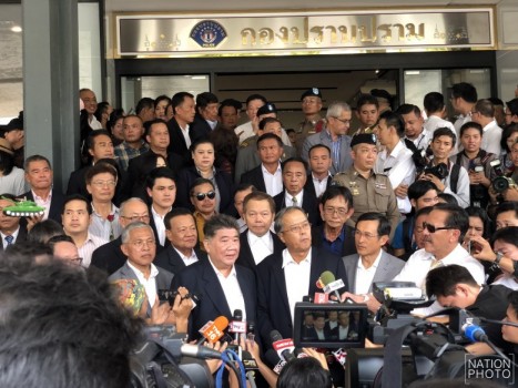 แกนนำพรรคเพื่อไทย 8 คน ได้แก่ พลตำรวจโทวิโรจน์ เปาอินทร์ รักษาการหัวหน้าพรรค , นายภูมิธรรม เวชยชัย รักษาการเลขาธิการพรรค,นายชูศักดิ์ ศิรินิล ประธานคณะทำงาน ฝ่ายกฎหมายพรรค,นายชัยเกษม นิติสิริ ,นายจาตุรนต์ ฉายแสง ,นายนพดล ปัทมะ , นายวัฒนา เมืองสุข และนายกิตติรัตน์ ณ ระนอง เดินทางมาพบพนักงานสอบสวน กองปราบปราม เพื่อรับทราบข้อกล่าวหาของ คสช. หลังสมาชิกพรรคเพื่อไทยตั้งโต๊ะวิจารณ์ ผลงาน 4 ปีของ คสช. ในข้อหาฝ่าฝืนคำสั่ง คสช.ฉบับที่ 57/57 ห้ามมิให้พรรคการเมือง ที่มีอยู่แล้วดําเนินการประชุม หรือดําเนินกิจการใดๆ ในทางการเมือง, ฝ่าฝืนคำสั่ง คสช. ที่ 3/58 ในข้อ 12 ชุมนุมทางการเมือง ตั้งแต่ 5 คนขึ้นไป, มาตรา 116 ยุยงปลุกปั่น และ พ.ร.บ.คอมพิวเตอร์ เนื่องจากมีการไลฟ์สด ในเฟซบุ๊ก ( ภาพจาก คมชัดลึก)