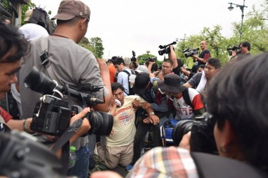 บรรยากาศการชุมนุมของกลุ่มคนอยากเลือกตั้ง ที่หน้ามหาวิทยาลัยธรรมศาสตร์ เกิดการ ดันกันไปมาระหว่างผู้ชุมนุมและตำรวจ ท่ามกลางสายฝน ขณะที่นายสิรวิชญ์ เสรีธิวัฒน์ หรือจ่านิว หนึ่งในแกนนำผู้ชุมนุม ทนต่อสภาพอากาศที่ร้อนอบอ้าว และฝนตกลงมาไม่ไหว เป็นลมคาที่ชุมนุม ต้องนำตัวไปปฐมพยาบาล