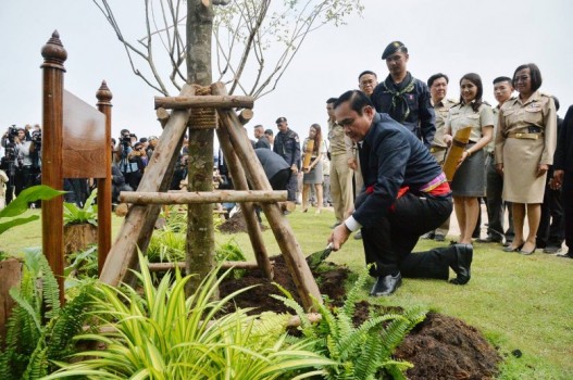 ที่ศูนย์ศึกษาวิธีการฟื้นฟูที่ดินเสื่อมโทรมเขาชะงุ้ม อันเนื่องมาจากพระราชดำริ ต.เขาชะงุ้ม อ.โพธาราม จ.ราชบุรี พล.อ.ประยุทธ์ จันทร์โอชา นายกรัฐมนตรีและหัวหน้าคณะรักษา ความสงบแห่งชาติ เป็นประธานในพิธีเปิดโครงการ “ประชารัฐร่วมใจ ปลูกต้นไม้ ให้แผ่นดิน” พ.ศ.2561 นายกรัฐมนตรี กล่าวตอนหนึ่งว่า นั่งเฮลิคอปเตอร์มารู้สึกมึนงง จากปกติที่สดชื่น แต่เมื่อนั่งวิเคราะห์แล้ว เป็นเพราะอากาศเสีย อยู่กรุงเทพฯ มีแต่อากาศเสีย เคยชินแต่ของเสีย แต่จากที่มองลงมาเห็นต้นไม้มาก อยากให้กรุงเทพฯ และทุกเมืองเป็นแบบนี้ ในหลวงรัชกาลที่ 9 ทรงปลูกต้นไม้มาตลอด 70 ปีที่ครองราชย์ ต้นไม้ที่ทรงปลูกไว้วันนี้สูงใหญ่ ตนเองจะมาดูต้นประดู่ที่พระองค์ทรงปลูกไว้ นายกรัฐมนตรี กล่าวอีกว่า วันนี้ อากาศดี ออกซิเจนเข้าปอด แต่เมื่อวานออกซิเจนน้อย เพราะมีการชุมนุม คนเยอะอากาศเป็นพิษ แต่ทุกอย่างเรียบร้อย ไม่ลุกลามบานปลาย เพราะประชาชนทุกคนเข้าใจ และรัฐบาลได้ประกาศไปแล้ว ทั้งนี้ ขอบคุณเจ้าหน้าที่ โดยเฉพาะทหาร ตำรวจที่แก้ปัญหาอย่างสันติ ไม่มีการตีกันหรือยิงกัน รัฐบาลไม่อยากให้บานปลาย เพราะต่างประเทศจับตาดูอยู่ รัฐบาลจำเป็นต้องเข้ามาควบคุมสถานการณ์ เพื่อให้เกิดความปลอดภัยในชีวิตและทรัพย์สิน เดินหน้าสู่ประชาธิปไตยและรัฐบาลที่มีธรรมาภิบาล พล.อ.ประยุทธ์ กล่าวต่อว่า พูดเพราะ ๆ ไม่ค่อยเป็น แต่ใจนึกถึงทุกศาสนาในประเทศไทย ที่ทั้ง 5 ศาสนาอยู่ด้วยกันอย่างสันติมาโดยตลอด ภายใต้พระบารมีของพระบรมราชจักรีวงศ์ ทุกพระองค์ ซึ่งวันนี้ถึงรัชกาลที่ 10 แล้ว รัชกาลนี้ต้องเป็นรัชกาลที่บ้านเมืองสงบปลอดภัย และมีความเป็นอยู่ มีชีวิตที่ดีขึ้น เป็นสิ่งที่รัฐบาลน้อมนำพระราโชบายของพระองค์มาปฏิบัติทุกเรื่อง ทั้งนี้ พระองค์ทรงคาดหวังว่าประเทศจะต้องดีขึ้น สงบยิ่งขึ้น มีสันติ มีการพัฒนา ปฏิรูป ทำทุกอย่างเพื่อความมั่นคง มั่งคั่ง และยั่งยืน จากนั้น นายกรัฐมนตรี ร่วมกิจกรรมปลูกต้นไม้เนื่องในวันต้นไม้แห่งชาติ โดยนายกฯ ปลูกต้นรวงผึ้ง ต้นไม้ประจำพระองค์ สมเด็จพระเจ้าอยู่หัวมหาวชิราลงกรณบดินทร เทพยวรางกูร ด้วยดอกรวงผึ้งมีสีเหลือง ซึ่งเป็นสีประจำวันพระราชสมภพ ขณะที่ ครม. ร่วมกันปลูกต้นกัลปพฤกษ์ ซึ่งเป็นต้นไม้ประจำ จ.ราชบุรี