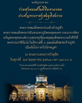 วันนี้ (25 พ.ค.) ตั้งแต่เวลา 18.00 น. ณ พระลานพระราชวังดุสิต จะมีการจัดงาน "พิธีมหามงคลบำเพ็ญพระราชกุศลอุทิศถวาย พระบาทสมเด็จพระปกเกล้าเจ้าอยู่หัว พระบาทสมเด็จพระปรมินทรมหาภูมิพลอดุลยเดช บรมนาถบพิตร เจริญพระพุทธมนต์ถวายพระพรชัยมงคล สมเด็จพระนางเจ้าสิริกิติ์ พระบรมราชินีนาถ ในรัชกาลที่ 9 และสมเด็จพระเจ้าอยู่หัว เนื่องในโอกาสวันวิสาขบูชา" ขณะนี้ ทุกหน่วยมีความพร้อม ทั้งด้านการจัดการจราจร การบริการประชาชน การแพทย์ฉุกเฉิน รถเมล์ฟรีรับ-ส่งประชาชน สถานที่จอดรถ โดยเฉพาะสภาพอากาศ มีเต็นท์รองรับพื้นที่นั่งสวดมนต์ จัดเตรียมร่มกันฝนไว้ประจำทุกจุดคัดกรอง รวมถึงรถเข็นวีลแชร์สำหรับผู้สูงอายุ คาดว่าจะมีประชาชนเข้าร่วมสวดมนต์ 8,000-10,000 คน สำหรับการจราจร ตั้งแต่เวลา 15.00 น. จะจัดการเดินรถทางเดียว ถนนราชดำเนินนอก ตั้งแต่แยกสวนมิสกวันถึงแยกพระรูป ร.5 โดยจะปัดให้เลี้ยวซ้ายไปแยกพล 1 และเลี้ยวขวาไปแยกวัดเบญฯ ส่วนที่จอดรถจะมี 3 จุด คือ จอดได้ที่สนามม้านางเลิ้ง 500 คัน /สวนสัตว์ดุสิต ด้านถนนอู่ทองใน ขอความร่วมมือสงวนไว้สำหรับผู้สูงอายุและผู้พิการ และจุดจอดรถจักรยานและรถจักรยานยนต์ ถนนนครปฐม หน้าวัดเบญบพิตร รองรับรถจักรยานยนต์ได้ 500 คัน จักรยาน 100 คัน