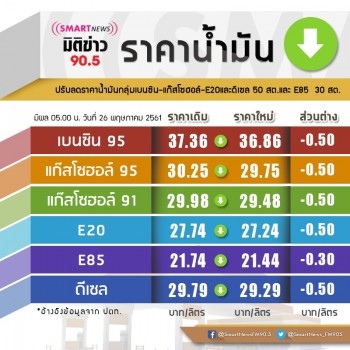 นางสาวจิราพร ขาวสวัสดิ์ รองกรรมการผู้จัดการใหญ่หน่วยธุรกิจน้ำมัน บริษัท ปตท. จำกัด (มหาชน) เปิดเผยว่า จากสถานการณ์ราคาน้ำมันในตลาดโลกที่มีการปรับตัวสูงขึ้นมาก อย่างต่อเนื่องตั้งแต่ช่วงปลายเดือนเมษายนต่อเนื่องมาจนถึงปัจจุบันนั้น ส่งผลให้ราคาน้ำมัน ทั้งเบนซินและดีเซล ในตลาดโลกปรับตัวขึ้นไปเป็นกว่า 90 ดอลลาร์สหรัฐต่อบาร์เรล ล่าสุด คาดว่าวันนี้ ราคาน้ำมันตลาดโลก น่าจะเริ่มมีแนวโน้มลดลงบ้าง ปตท. จึงปรับลดราคา น้ำมันลงทันที ถึงแม้ราคาน้ำมันตลาดโลกภายหลังการปรับตัวลงจะยังคงอยู่ในระดับสูง โดยกลุ่มเบนซิน ลดลง 50 สตางค์ต่อลิตร เว้น E85 ลดลง 30 สตางค์ต่อลิตร และกลุ่มดีเซล ลดลง 50 สตางค์ต่อลิตร มีผลในวันพรุ่งนี้ (26 พ.ค.2561) เวลา 05.00 น. เป็นต้นไป ส่งผลให้ราคาน้ำมันขายปลีกในเขต กทม.และปริมณฑลเป็น ดังนี้ น้ำมันเบนซิน 95 อยู่ที่ 36.86 บาท น้ำมันแก๊สโซฮอล์ 95 อยู่ที่ 29.75 บาท น้ำมันแก๊สโซฮอล์ 91 อยู่ที่ 29.48 บาท น้ำมันแก๊สโซฮอล์ E20 อยู่ที่ 27.24 บาท น้ำมันแก๊สโซฮอล์ E85 อยู่ที่ 21.44 บาท น้ำมันดีเซลหมุนเร็ว 29.29 บาท น้ำมันอัลตรา ฟอร์ซ พรีเมียม ดีเซล 32.29 บาท สำหรับสถานการณ์ราคาน้ำมันในตลาดโลกในขณะนี้ ปตท. จะยังคงนโยบายติดตาม อย่างใกล้ชิด และขอให้ประชาชนร่วมกันใช้เชื้อเพลิงอย่างประหยัด เพื่อให้เกิดประสิทธิภาพ มากที่สุดด้วย