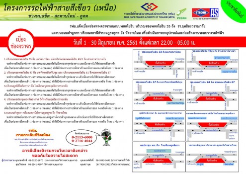 การรถไฟฟ้าขนส่งมวลชนแห่งประเทศไทย (รฟม.) แจ้งว่า กิจการร่วมค้าสเตค-เอเอส-4 ผู้รับจ้างก่อสร้างงานระบบราง โครงการรถไฟฟ้าสายสีเขียว (เหนือ) ช่วงหมอชิต–สะพานใหม่–คูคต สัญญาที่ 4 จะดำเนินการยกอุปกรณ์และก่อสร้างงานระบบรางรถไฟฟ้า จึงมีความจำเป็นต้องเบี่ยงการจราจรบนถนนพหลโยธิน บริเวณซอยพหลโยธิน 33 ถึงโรงเรียนฤทธิยะวรรณาลัย และเบี่ยงช่องทางจราจรบนถนนลำลูกกา บริเวณสถานีตำรวจภูธรคูคตถึงวัดสายไหม ในวันที่ 1-30 มิถุนายน 2561 ตั้งแต่เวลา 22.00-05.00 น. โดยมีรายละเอียดดังต่อไปนี้ 1.บริเวณซอยพหลโยธิน 33 ถึง แยกเสนานิคม และ บริเวณซอยพหลโยธิน 49/1 ถึง สวนอาหารบางบัว จะทำการเบี่ยงช่องทางจราจรบนถนนพหลโยธินฝั่งขาออกทุกช่องทางแล้วเบี่ยงขวาไปใช้ช่องทางฝั่งขาเข้าเพื่อเป็นช่องทางฝั่งขาออก 1 ช่องทาง (ทดแทน) ทำให้มีช่องทางจราจรทั้งฝั่งขาเข้าและฝั่งขาออกคงเหลือฝั่งละ 1 ช่องทาง 2.บริเวณซอยพหลโยธิน 47 ถึง มหาวิทยาลัยศรีปทุม และบริเวณซอยพหลโยธิน 61 ถึง ซอยพหลโยธิน 67 จะทำการเบี่ยงช่องทางจราจรบนถนนพหลโยธินฝั่งขาเข้าทุกช่องทางแล้วเบี่ยงขวาไปใช้ช่องทางฝั่งขาออกเพื่อเป็นช่องทางฝั่งขาเข้า 1 ช่องทาง (ทดแทน) ทำให้มีช่องทางจราจรทั้งฝั่งขาเข้าและฝั่งขาออกคงเหลือฝั่งละ 1 ช่องทาง 3.บริเวณมูลนิธิโพธิภาวนา ถึง ร.ร.อนุบาลฤทธิยะวรรณาลัย จะเบี่ยงช่องทางจราจรบนถนนพหลโยธินฝั่งขาออกทุกช่องทางแล้วเบี่ยงขวาไปใช้ช่องทางฝั่งขาเข้าเพื่อเป็นช่องทางฝั่งขาออก 1 ช่องทาง (ทดแทน) ทำให้มีช่องทางจราจรทั้งฝั่งขาเข้าและฝั่งขาออกคงเหลือฝั่งละ 1 ช่องทาง 4.บริเวณหอประชุมกองทัพอากาศ ถึงโรงเรียนฤทธิยะวรรณาลัย จะทำการเบี่ยงช่องทางจราจรบนถนนพหลโยธินฝั่งขาเข้าทุกช่องทางแล้วเบี่ยงขวาไปใช้ช่องทางฝั่งขาออกเพื่อเป็นช่องทางฝั่งขาเข้า 1 ช่องทาง (ทดแทน) ทำให้มีช่องทางจราจรทั้งฝั่งขาเข้าและฝั่งขาออกคงเหลือฝั่งละ 1 ช่องทาง 5.บริเวณสถานีตำรวจภูธรคูคต ถึงวัดสายไหม จะเบี่ยงช่องทางจราจรบนถนนลำลูกกาฝั่งขาเข้าทุกช่องทางแล้วเบี่ยงขวาไปใช้ช่องทางฝั่งขาออกเพื่อเป็นช่องทางฝั่งขาเข้า 1 ช่องทาง (ทดแทน) ทำให้มีช่องทางจราจรทั้งฝั่งขาเข้าและฝั่งขาออกคงเหลือฝั่งละ 1 ช่องทาง ทั้งนี้ การเบี่ยงจราจรเพื่อดำเนินการยกอุปกรณ์และก่อสร้างงานระบบรางรถไฟฟ้า อาจทำให้ผู้ใช้เส้นทางไม่ได้รับความสะดวกในการเดินทางหากไม่มีความจำเป็น โปรดหลีกเลี่ยงเส้นทาง