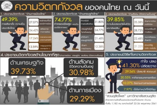 “สวนดุสิตโพล” มหาวิทยาลัยสวนดุสิต สำรวจความคิดเห็นประชาชนทั่วประเทศ 1,182 คน ระหว่างวันที่ 22-26 พ.ค. ถึงสิ่งที่ประชาชนวิตกกังวล ณ วันนี้ พบว่า ด้านการเมืองไทย อันดับ 1 การเลือกตั้งและความเป็นประชาธิปไตยของบ้านเมือง 49.39% อันดับ 2 พฤติกรรมที่ไม่ดีของนักการเมือง ใส่ร้าย โจมตี เห็นแก่พวกพ้อง คอรัปชั่น 27.07% อันดับ 3 การบริหารประเทศและเสถียรภาพทางการเมือง 24.42% อันดับ 4 การทะเลาะเบาะแว้ง แตกแยก ขาดความสามัคคี 17.24% อันดับ 5 การเคลื่อนไหว การชุมนุมประท้วงของกลุ่มต่าง ๆ ที่มีแนวโน้มรุนแรงมากขึ้น 13.59% ด้านเศรษฐกิจไทย อันดับ 1 ค่าครองชีพสูง ของกินของใช้ราคาแพง น้ำมัน ก๊าซหุงต้มขึ้นราคา 74.77% อันดับ 2 ค้าขายไม่ดี การเงินฝืดเคือง 31.80% อันดับ 3 เศรษฐกิจของประเทศไม่ดี ต่างชาติไม่กล้ามาลงทุน 24.77% อันดับ 4 รัฐบาลแก้ปัญหาเศรษฐกิจไม่ได้ 21.48% อันดับ 5 การจ้างงาน ตกงาน ปัญหาการว่างงาน 12.38% ด้านสังคม ชีวิตความเป็นอยู่ อันดับ 1 ความไม่ปลอดภัยในชีวิตและทรัพย์สิน 39.85% อันดับ 2 ปัญหาปากท้อง รายได้น้อย รายจ่ายเยอะ เป็นหนี้ 35.38% อันดับ 3 ความเหลื่อมล้ำทางสังคม มีความแตกต่างระหว่างคนรวยกับคนจนสูง 28.72% อันดับ 4 คนขาดศีลธรรม เห็นแก่ตัว อารมณ์ร้อน มีเรื่องกันง่ายขึ้น 22.48% อันดับ 5 เจ้าหน้าที่รัฐใช้อำนาจหน้าที่ในทางที่ผิด ทุจริต คอรัปชั่น 21.23% เมื่อเปรียบเทียบสิ่งที่ประชาชนวิตกกังวล พบว่า ด้านเศรษฐกิจประชาชนวิตกกังวลมากที่สุด 39.73% เพราะกระทบต่อชีวิตความเป็นอยู่การดำรงชีพ สภาพการเงินไม่คล่อง ตามด้วย ด้านสังคม ชีวิตความเป็นอยู่ 30.98% เพราะเป็นเรื่องใกล้ตัว รู้สึกไม่ปลอดภัย อันดับ 3 ด้านการเมือง 29.29% เพราะต่างชาติไม่ให้การยอมรับ ไม่เป็นประชาธิปไตย สร้างความขัดแย้ง บ้านเมืองวุ่นวาย ไม่สงบ กระทบต่อเศรษฐกิจ ฯลฯ