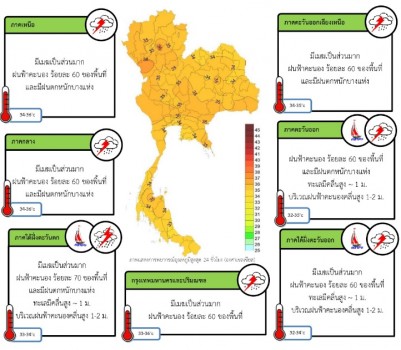 พยากรณ์อากาศ 24 ชั่วโมงข้างหน้า ประเทศไทยยังมีฝนฟ้าคะนองเพิ่มขึ้น กับมีฝนตกหนักบางแห่ง บริเวณทางตะวันตกของภาคเหนือและภาคกลาง ภาคตะวันออก และภาคใต้ฝั่งตะวันตก ขอให้ประชาชนระวังอันตรายจากฝนฟ้าคะนอง ฝนตกหนักและฝนที่ตกสะสมไว้ด้วย ทุกภาค กรุงเทพมหานครและปริมณฑล มีเมฆเป็นส่วนมาก กับมีฝนฟ้าคะนอง ร้อยละ 60 ของพื้นที่ และมีฝนตกหนักบางแห่ง ยกเว้นภาคใต้ (ฝั่งตะวันตก) มีฝนฟ้าคะนอง ร้อยละ 70 ของพื้นที่ และมีฝนตกหนักบางแห่ง