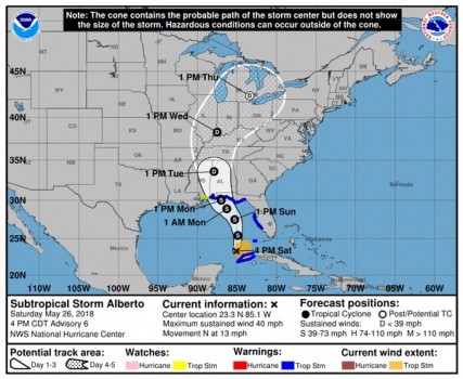 นายริค สกอตต์ ผู้ว่าการรัฐฟลอริดา ประกาศสถานการณ์ฉุกเฉินครอบคลุมทั้ง 67 เขต ของรัฐฟลอริดา ซึ่งมีประชากรรวมกันเกือบ 21 ล้านคน สูงสุดเป็นอันดับ 3 ของประเทศ และเตรียมกำลังเจ้าหน้าที่กองกำลังพิทักษ์มาตุภูมิอีก 5,500 นาย เพื่อรับมือพายุอัลแบร์โต พายุหมุนลูกแรกของปีนี้ ศูนย์เฮริเคนแห่งชาติ ระบุว่า พายุหมุนกึ่งเขตร้อนลูกนี้ อยู่ห่างจากชายฝั่งของเมืองแทมปา ออกไปทางตะวันตกประมาณ 265 กิโลเมตร เมื่อช่วงเย็นของวันอาทิตย์ตามเวลาท้องถิ่น และมีความเร็วลมเฉลี่ยอยู่ที่ 85 กิโลเมตรต่อชั่วโมง คาดการณ์ทิศทางการเคลื่อนที่ของพายุ มุ่งหน้าทิศตะวันตกเฉียงเหนือ ผ่านพื้นที่ทางเหนือของอ่าวเม็กซิโก ก่อนเข้าสู่แผ่นดินใหญ่ ของสหรัฐ บริเวณเขตที่ราบลุ่มกระทะของรัฐฟลอริดา ในวันจันทร์นี้ตามเวลาท้องถิ่น พร้อมทั้งเตือนภัยการเกิดคลื่นพายุซัดฝั่งขนาดยักษ์ตลอดแนวชายฝั่ง และปริมาณ น้ำฝนสะสมที่อาจสูงถึง 30 เซนติเมตร ครอบคลุมรัฐมิสซิสซิปปีและฝั่งตะวันตก ของรัฐจอร์เจียด้วย ด้านนายแลร์รี โฮแกน ผู้ว่าการรัฐแมริแลนด์ ประกาศภาวะฉุกเฉินในเมืองเอลลิคอตต์ ที่อยู่ทางตะวันออก หลังเกิดน้ำท่วมฉับพลัน จากพายุฝนฟ้าคะนองรุนแรงเมื่อวันเสาร์ที่ผ่านมา