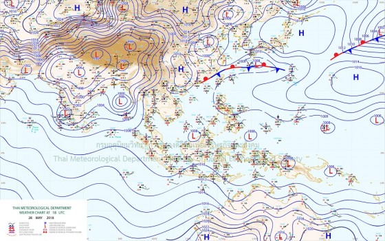พยากรณ์อากาศ 24 ชั่วโมงข้างหน้า ประเทศไทยยังคงมีฝนฟ้าคะนองต่อเนื่องกับมีฝนตกหนัก บางแห่ง บริเวณทางตะวันตกของภาคเหนือ ภาคกลาง และภาคใต้ ขอให้ประชาชนบริเวณ ดังกล่าวระวังอันตรายจากฝนฟ้าคะนอง ฝนตกหนักและฝนที่ตกสะสมไว้ด้วย ส่วนคลื่นลม บริเวณทะเลอันดามันตอนบนมีกำลังปานกลาง ทะเลมีคลื่นสูงประมาณ 2 เมตร ชาวเรือ บริเวณทะเลอันดามันตอนบนควรเดินเรือด้วยความระมัดระวัง ลักษณะสำคัญทางอุตุนิยมวิทยา หย่อมความกดอากาศต่ำกำลังแรงปกคลุมอ่าวเบงกอล ตอนบน กำลังเคลื่อนเข้าปกคลุมประเทศเมียนมาในช่วงวันที่ 29-30 พ.ค. 2561 ประกอบกับ มรสุมตะวันตกเฉียงใต้พัดปกคลุมทะเลอันดามัน ประเทศไทย และอ่าวไทย ลักษณะเช่นนี้ ทำให้ประเทศไทยยังคงมีฝนฟ้าคะนอง กับมีฝนตกหนักบางแห่งด้านตะวันตกของประเทศ สำหรับคลื่นลมบริเวณทะเลอันดามันตอนบนมีกำลังปานกลาง พยากรณ์อากาศสำหรับประเทศไทยตั้งแต่เวลา 06:00 วันนี้ ถึง 06:00 วันพรุ่งนี้. ภาคเหนือ มีเมฆเป็นส่วนมาก กับมีฝนฟ้าคะนอง ร้อยละ 70 ของพื้นที่ ภาคตะวันออกเฉียงเหนือ ภาคกลาง ภาคตะวันออก ภาคใต้ (ฝั่งตะวันออก) มีเมฆเป็นส่วนมาก กับมีฝนฟ้าคะนอง ร้อยละ 60 ของพื้นที่ ภาคใต้ (ฝั่งตะวันตก) มีเมฆเป็นส่วนมาก กับมีฝนฟ้าคะนอง ร้อยละ 70 ของพื้นที่ กรุงเทพมหานครและปริมณฑล มีเมฆเป็นส่วนมาก กับมีฝนฟ้าคะนอง ร้อยละ 60 ของพื้นที่