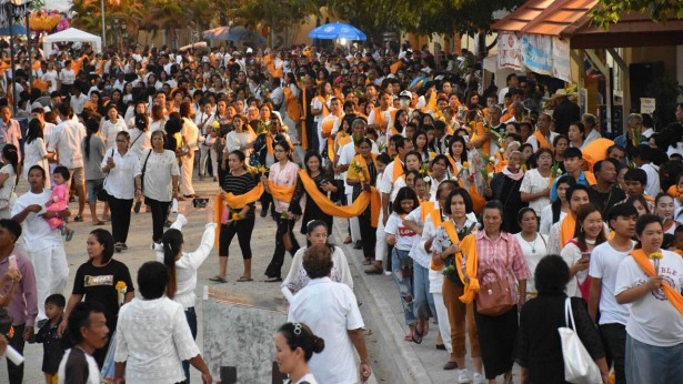 ที่ลานหาดทรายแก้ว เบื้องหน้าองค์พระบรมธาตุเจดีย์ วัดพระมหาธาตุวรมหาวิหาร อำเภอเมืองนครศรีธรรมราช พุทธศาสนิกชนจำนวนมาก ร่วมทำบุญตักบาตรพระสงฆ์ หลายร้อยรูป โดยมีพระเทพวินยาภรณ์ เจ้าอาวาสวัดพระมหาธาตุวรมหาวิหาร กล่าวสัมโมทนียกถา ขณะที่พุทธศาสนิกชนอีกจำนวนมาก เริ่มประกอบพิธีแห่ผ้าพระบฎกระทำทักษิณาวัตร รอบเขตพุทธาวาสองค์พระบรมธาตุเจดีย์ ซึ่งมีความเชื่อว่า เป็นสถานที่ประดิษฐาน พระบรมสารีริกธาตุ ขององค์สมเด็จพระสัมมาสัมพุทธเจ้า และช่วงค่ำของวันนี้คาดว่า จะมีพุทธศาสนิกชนนับหมื่นคน หลั่งไหลเข้ามาประกอบพิธีเวียนเทียนรอบพระวิหารหลวงแล