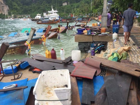 เจ้าหน้าที่ชุดแจ้งเหตุเฝ้าระวังศูนย์ช่วยเหลือนักท่องเที่ยว จังหวัดกระบี่ เข้าตรวจสอบเหตุ ลมพัดแรงและมีคลื่นสูง ซัดเข้าฝั่งบริเวณอ่าวต้นไทร ที่หมู่ 7 เกาะพีพี ตำบลอ่าวนาง อำเภอ เมืองกระบี่ ส่งผลทำให้เรือหางยาวที่จอดลอยลำอยู่หน้าหาด ล่มจมน้ำ และบางลำกระแทกกัน จนได้รับความเสียหายเกือบ 10 ลำ ข้าวของภายในเรือลอยเกลื่อนเต็มชายหาด ชาวบ้าน บอกว่า เหตุดังกล่าวเกิดขึ้น เนื่องจากมีลมพัดมาอย่างรุนแรงและมีคลื่นสูงจาก ทิศตะวันออก หรือที่ชาวบ้านเรียก "ลมหัวนอน" จะมีความแรงมาก และพัดเข้าฝั่ง ทำให้เรือ ที่จอดทอดสมออยู่ ถูกคลื่นสูงซัดและกระแทกจนล่มรวม 8 ลำ ทำให้เรือและเครื่องยนต์เสียหาย ขณะนี้กำลังเข้าเก็บกู้