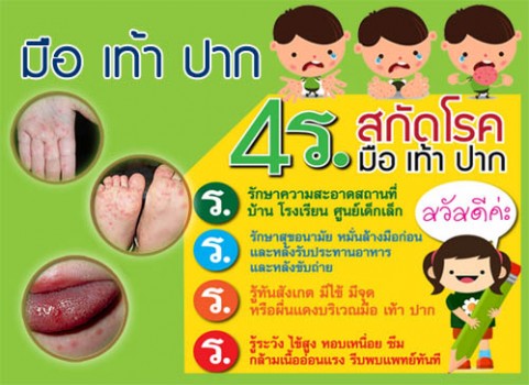 นายแพทย์วชิระ เพ็งจันทร์ อธิบดีกรมอนามัย เปิดเผยว่า ประเทศไทยกำลังเข้าสู่ฤดูฝน ซึ่งจะมีอากาศเย็นและชื้นจนทำให้โรคมือ เท้า ปาก กลับมาระบาดอีกครั้งได้ โดยเฉพาะในกลุ่มเด็กซึ่งมีภูมิต้านทานต่ำ และในช่วงเปิดเทอมที่เด็กต้องอยู่รวมกันเป็นจำนวนมากในศูนย์เด็กเล็กและโรงเรียน โดยแนะนำให้เฝ้าระวังด้วยหลัก 4 ร. คือ 1) ร.รักษาความสะอาดสถานที่ บ้าน โรงเรียน ศูนย์เด็กเล็ก 2) ร.รักษาสุขอนามัย หมั่นล้างมือก่อนและหลังกินอาหาร และหลังขับถ่าย 3) ร.รู้ทันสังเกต มีไข้ มีจุด หรือผื่นแดงบริเวณมือ เท้า ปาก และ 4) ร.ระวัง ไข้สูง หอบเหนื่อย ซึม กล้ามเนื้ออ่อนแรง ถ้าพบมีอาการให้รีบพาไปพบแพทย์เพื่อทำการรักษา