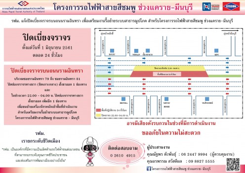 การรถไฟฟ้าขนส่งมวลชนแห่งประเทศไทย หรือ รฟม.แจ้งว่า บริษัท ซิโน-ไทย เอ็นจีเนียริ่ง แอนด์ คอนสตรัคชั่น จำกัด (มหาชน) ผู้รับจ้างก่อสร้างงานโยธา โครงการรถไฟฟ้าสายสีชมพู ช่วงแคราย - มีนบุรี มีความจำเป็นต้องเบี่ยงจราจร บนถนนรามอินทรา บริเวณซอยรามอินทรา 69 ถึง บริเวณร้านแสงทวีการไฟฟ้า เพื่อเตรียมงานรื้อย้ายระบบสาธารณูปโภคของโครงการฯ ตั้งแต่คืนนี้ ( 3 มิ.ย.) เป็นต้นไป โดยมีรายละเอียดดังต่อไปนี้ - ปิดการจราจรช่องทางขวา (ชิดเกาะกลาง) 1 ช่องจราจร ฝั่งขาออก มุ่งหน้ามีนบุรี ตลอด 24 ชั่วโมง - ปิดการจราจรช่องทางขวา (ชิดเกาะกลาง) เพิ่มอีก 1 ช่องจราจร ฝั่งขาออก มุ่งหน้ามีนบุรี ในช่วงเวลา 22.00 - 04.00 น. เพื่อขนย้ายเครื่องจักรหนักเข้าพื้นที่ดำเนินงาน ทั้งนี้ การดำเนินงานดังกล่าวอาจส่งผลให้การจราจรชะลอตัว ติดขัด และอาจมีเสียงดังรบกวน โดยระหว่างดำเนินงาน จะมีการติดตั้งป้ายเตือนล่วงหน้าก่อนถึงจุดเบี่ยง ป้ายจราจร กรวยยาง และสัญญาณไฟส่องสว่าง เพื่อความปลอดภัยของผู้ใช้เส้นทาง รฟม. จึงขออภัยในความไม่สะดวก สำหรับผู้ที่ต้องการสอบถามรายละเอียดการเบี่ยงจราจรเพิ่มเติม สามารถติดต่อได้ที่เบอร์ 0 2610 4915, 09 8827 5555