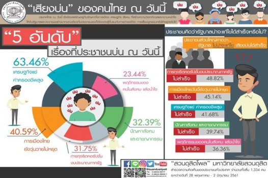 “สวนดุสิตโพล” มหาวิทยาลัยสวนดุสิต สำรวจความคิดเห็นประชาชนทั่วประเทศ ในหัวข้อ “เสียงบ่น” ของคนไทย ณ วันนี้ จากประชาชน 1,334 คน ระหว่างวันที่ 28 พฤษภาคม - 2 มิถุนายน เนื่องจากประเทศไทย ณ วันนี้ ยังต้องเผชิญปัญหาทั้งการเมือง เศรษฐกิจ สังคม ที่สร้างความวิตกกังวลและความหนักใจ ให้แก่รัฐบาลและประชาชนอย่างมาก ประชาชนต้องต่อสู้ดิ้นรนกับการดำรงชีวิต การเลี้ยงดูครอบครัว พบว่า “5 อันดับ” เรื่องที่ประชาชนบ่น ณ วันนี้ พร้อมบอกสาเหตุ และแนวทางแก้ไข อันดับ 1 เศรษฐกิจแย่ ค่าครองชีพสูง เงินไม่พอใช้ 63.46% สาเหตุที่บ่น เพราะเศรษฐกิจซบเซา ภาระเยอะ ค่าใช้จ่ายสูง ข้าวของมีราคาแพง รายได้ไม่พอกับรายจ่าย ต้องกู้ยืม ฯลฯ แนวทางแก้ไข คือ เร่งแก้ปัญหาเศรษฐกิจ กระตุ้นการค้าการลงทุน ควบคุมราคาสินค้า ขึ้นเงินเดือน เพิ่มค่าแรง ฯลฯ อันดับ 2 การเมืองไทยวันนี้ยังวุ่นวายไม่หยุด 40.59% เพราะกระทบเศรษฐกิจและภาพลักษณ์ของประเทศ เบื่อ มัวแต่ทะเลาะกัน ยังไม่มีเลือกตั้ง ไม่เป็นประชาธิปไตย ฯลฯ แนวทางแก้ไข คือ รับฟังความคิดเห็น ทุกฝ่ายร่วมมือกัน เห็นแก่บ้านเมือง มีการเลือกตั้ง ให้คนรุ่นใหม่เข้ามาทำงาน ฯลฯ อันดับ 3 ปัญหาสังคม และอาชญากรรมยังน่ากลัว 32.39% เพราะเป็นภัยใกล้ตัว เกิดขึ้นได้ทุกเมื่อ มีหลายรูปแบบ รุนแรงมากขึ้น สังคมย่ำแย่ ยาเสพติดแพร่ระบาด ฯลฯ แนวทางแก้ไข คือ เจ้าหน้าที่เข้มงวดกวดขัน กฎหมายเด็ดขาด เพิ่มสายตรวจทุกจุด ปลูกฝังจิตสำนึก ช่วยกันดูแล อันดับ 4 การทุจริตคอรัปชั่นงบประมาณภาครัฐ ท้องถิ่นยังมีอยู่มาก 31.75% เพราะมีข่าวให้เห็นบ่อยครั้ง เป็นการเอาเปรียบประชาชน ไม่เป็นธรรม แก้ไม่หมด ประเทศไม่พัฒนา แนวทางแก้ไข คือ ตรวจสอบและลงโทษอย่างจริงจัง ไล่ออก ยึดทรัพย์ จำคุกตลอดชีวิต ไม่ช่วยเหลือปกป้องพวกพ้อง ฯลฯ อันดับ 5 พฤติกรรมของคนในสังคม แล้งน้ำใจ 23.44% สาเหตุที่บ่น เพราะคนเห็นแก่ตัว เอารัดเอาเปรียบ ใช้อารมณ์ ขาดสติ ใช้สื่อโซเชียลในทางที่ผิด เป็นห่วงลูกหลาน ฯลฯ แนวทางแก้ไข คือ รณรงค์ กระตุ้นให้ทุกคนมีวินัย เคารพซึ่งกันและกัน พัฒนาการศึกษา มีคุณธรรม พ่อแม่มีเวลาให้ ฯลฯ เมื่อถามว่า คิดว่ารัฐบาลน่าจะแก้ไขได้สำเร็จหรือไม่? *** ประชาชนส่วนใหญ่คาดว่ารัฐบาลไม่น่าจะแก้ไขเสียงบ่นได้สำเร็จ*** โดยการทุจริตคอรัปชั่นงบประมาณภาครัฐ ท้องถิ่นยังมีอยู่มาก เห็นว่าไม่สำเร็จ 48.82 % สำเร็จ 19.87% ไม่แน่ใจ 31.31% ส่วนการเมืองไทยวันนี้ยังวุ่นวายไม่หยุด 45.14% เชื่อว่าแก้ไม่สำรเร็จ ที่เห็นว่าสำเร็จ 20.73% และไม่แน่ใจ 34.13% เศรษฐกิจแย่ ค่าครองชีพสูง เงินไม่พอใช้ แก้ไม่สำเร็จ 41.68% สำเร็จ 24.41% ไม