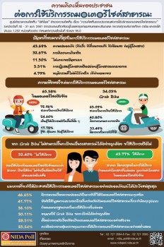ศูนย์สำรวจความคิดเห็น “นิด้าโพล” สถาบันบัณฑิตพัฒนบริหารศาสตร์ (นิด้า) เปิดเผยผลสำรวจความคิดเห็นประชาชน เรื่อง “ความคิดเห็นของประชาชนต่อการใช้บริการรถมอเตอร์ไซค์สาธารณะ ในเขตกรุงเทพมหานครและปริมณฑล” ระหว่างวันที่ 30-31 พฤษภาคม กรณีศึกษาจากประชาชนที่พักอาศัยอยู่ ในเขตกรุงเทพมหานครและปริมณฑล กระจายทุกระดับการศึกษา อาชีพ และรายได้ รวม 1,252 หน่วยตัวอย่าง เกี่ยวกับการใช้บริการรถมอเตอร์ไซค์สาธารณะ ในเขตกรุงเทพมหานครและปริมณฑล พบว่า ปัญหาที่พบมากที่สุดในการใช้บริการรถมอเตอร์ไซค์สาธารณะ ส่วนใหญ่ 43.69% ระบุว่า ความปลอดภัย 32.67% การคิดราคาเกินจริง ขณะที่ 11.50% ไม่เคยพบเจอปัญหาเลย ด้านความพึงพอใจต่อการเลือกใช้บริการรถมอเตอร์ไซค์สาธารณะ ระหว่าง “Grab Bike” กับ “วินมอเตอร์ไซค์รับจ้าง” พบว่า ประชาชนส่วนใหญ่ 65.58% ระบุว่า เลือกใช้บริการ “วินมอเตอร์ไซค์รับจ้าง” ขณะที่ 34.03% เลือกใช้บริการ “Grab Bike” จำนวนของผู้ที่เลือกใช้บริการ “วินมอเตอร์ไซค์รับจ้าง” ให้เหตุผล ส่วนใหญ่ 72.96% ระบุว่า สะดวกในการใช้บริการ (มีอยู่ทั่วไปในทุกชุมชน) ไม่จำเป็นต้องมี App Grab Bike รองลงมา 24.60% เป็นผู้ให้บริการหลักในพื้นที่นั้น ๆ 17.78% รู้จัก คุ้นเคย กับผู้ให้บริการ สำหรับในจำนวนของผู้ที่เลือกใช้บริการ “Grab Bike”ให้เหตุผล ส่วนใหญ่ 65.09% ระบุว่า สะดวกในการเรียกใช้บริการ (ผ่านแอปพลิเคชัน) รองลงมา 40.80% ราคาตามระยะทางจริงที่คำนวณให้ทราบก่อนใช้บริการ และ 33.49% มีมารยาทในการขับขี่ที่ดี เมื่อถามถึงว่า หาก Grab Bike ไม่สามารถขึ้นทะเบียนในการเป็นรถสาธารณะได้อย่างถูกต้อง จะใช้บริการหรือไม่ พบว่า ประชาชนส่วนใหญ่ 52.40% ระบุว่า ไม่ใช้ ขณะที่ 43.77% ใช้บริการ เมื่อถามถึงแนวทางที่จะทำให้ใช้บริการรถมอเตอร์ไซค์สาธารณะให้ปลอดภัย และได้ประโยชน์สูงสุด พบว่า ประชาชน ส่วนใหญ่ 46.65% ระบุมีการอบรมเรื่องความปลอดภัยในการขับขี่ ให้มอเตอร์ไซค์สาธารณะที่ให้บริการประชาชนทุกชนิด ตามด้วย การบังคับใช้กฎหมายและบทลงโทษที่เคร่งครัด กำหนดมาตรฐานราคาในการใช้บริการที่แน่นอน