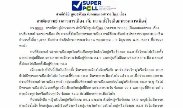 ดร.นพดล กรรณิกา ผู้อำนวยการสำนักวิจัยซูเปอร์โพล (SUPER POLL) เปิดเผยผลสำรวจ เรื่อง คนติดตามข่าวสารการเมืองกับความตั้งใจเลือกพรรคการเมือง โดยศึกษาตัวอย่างประชาชนทุกสาขาอาชีพ 1,026 ตัวอย่าง พบว่า คนที่ติดตามข่าวสารการเมืองทุกวันหรือเกือบทุกวัน ส่วนใหญ่ หรือ 84.9% ตั้งใจจะไปเลือกตั้ง มากกว่ากลุ่มที่ติดตามข่าวสารการเมืองบางวัน 0.2 % หรืออยู่ที่ 84.7% และกลุ่มที่ไม่ติดตามข่าวสารการเมืองเลยแต่ตั้งใจจะไปเลือกตั้ง มีอยู่ 73.3% ส่วนถ้าวันนี้เป็นวันเลือกตั้ง มีพรรคการเมืองในใจหรือยัง พบว่า ส่วนใหญ่ 81.2% ยังไม่มีพรรคการเมืองใดในใจ มีเพียง 18.8% ที่มีพรรคการเมืองในใจแล้ว และเมื่อจำแนกออกตามความถี่ติดตามข่าวการเมือง พบว่า กลุ่มคนที่ไม่ติดตามข่าวการเมืองเลย ส่วนใหญ่ หรือ 86.2% ระบุ ยังไม่มีพรรคการเมืองในใจมากที่สุด เมื่อเทียบกับกลุ่มที่ติดตามข่าวสารบางวัน 79.1% และกลุ่มที่ติดตามข่าวการเมืองทุกวันหรือเกือบทุกวัน 84.2% ยังไม่มีพรรคการเมืองในใจ ที่น่าสนใจ คือ เพศหญิงส่วนใหญ่ 82.4% และชายส่วนใหญ่ 78.9% ระบุยังไม่มีพรรคการเมืองในใจ โดยกลุ่มมนุษย์เงินเดือนหรือกลุ่มคนวัยทำงานส่วนใหญ่ 85.6% ยังไม่มีพรรคการเมือง อยู่ในใจ และกลุ่มคนสูงวัย ส่วนใหญ่ 83.3% ยังไม่มีพรรคการเมืองในใจ และที่น่าพิจารณา คือ กลุ่มเยาวชนเกินกว่า 1 ใน 5 หรือ 22.8% กลับระบุว่า มีพรรคการเมืองในใจแล้ว นอกจากนี้ กลุ่มคนที่มีการศึกษาต่ำกว่าปริญญาตรี เกินกว่า 1 ใน 4 หรือ 26.5% มีพรรคการเมืองในใจแล้ว ถ้าวันนี้เป็นวันเลือกตั้ง ขณะที่กลุ่มคนที่มีการศึกษาปริญญาตรีส่วนใหญ่ 88.7% ยังไม่มีพรรคการเมืองในใจ