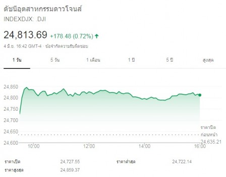 ดัชนีอุตสาหกรรมดาวโจนส์ ตลาดหุ้นนิวยอร์ก ปิดบวกติดต่อกัน 2 วันทำการเมื่อคืนนี้ (4 มิ.ย.) โดยปิดที่ 24,813.69 จุด เพิ่มขึ้น 178.48 จุด หรือ +0.72% ขณะที่ดัชนี S&P500 ปิดที่ 2,746.87 จุด เพิ่มขึ้น 12.25 จุด หรือ +0.45% และดัชนี Nasdaq ปิดที่ 7,606.46 จุด เพิ่มขึ้น 52.13 จุด หรือ +0.69% หุ้นกลุ่มเทคโนโลยีพุ่งขึ้น ช่วยหนุนดัชนี Nasdaq ปิดแตะระดับสูงสุดเป็นประวัติการณ์ โดยหุ้นแอปเปิลปิดบวก 0.8% หลังจากทะยานขึ้นทำนิวไฮในระหว่างวัน จากข่าวการเปิดตัวระบบปฏิบัติการ iOS 12 ซึ่งมีลูกเล่นในการแก้ปัญหาเสพติดมือถือของผู้ใช้ iPhone ส่วนหุ้นอเมซอนดอทคอม พุ่งขึ้น 1.4% หุ้นแอดวานซ์ ไมโคร ดิไวซ์ (เอเอ็มดี) ขึ้น 3.1% หุ้นอัลฟาเบท บริษัทแม่ของกูเกิล พุ่งขึ้น 1.6% เช่นเดียวกับหุ้นกลุ่มค้าปลีกพุ่งขึ้นหลังจากนักวิเคราะห์ปรับเพิ่มน้ำหนักความน่าลงทุนของหุ้นกลุ่มค้าปลีก โดยหุ้นทาร์เก็ต ทะยานขึ้น 4.9% หุ้นโคห์ล คอร์ป พุ่งขึ้น 4.7% หุ้นเมซี อิงค์ ขึ้น 4.3%