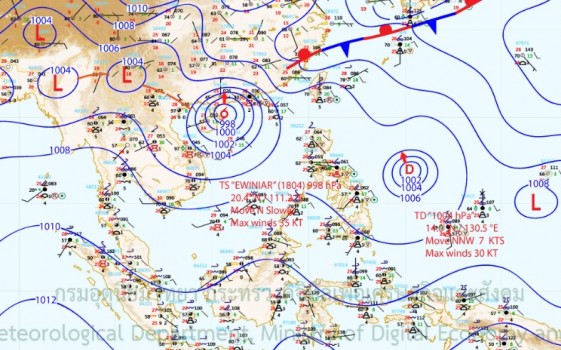 ประกาศกรมอุตุนิยมวิทยา "พายุดีเปรสชัน บริเวณทะเลจีนใต้" ฉบับที่ 19 เมื่อเวลา 04.00 น. พายุโซนร้อน “เอวิเนียร์”(EWINIAR) บริเวณทะเลจีนใต้ตอนบน มีศูนย์กลางอยู่ทางทิศเหนือของเกาะไหหลำ ประเทศจีน ความเร็วลมสูงสุดใกล้ศูนย์กลางประมาณ 65 กม./ชม. กำลังเคลื่อนตัวขึ้นไปทางทิศเหนืออย่างช้าๆ และคาดว่าจะเคลื่อนเข้าสู่ทางตอนใต้ของมณฑลกวางตุ้ง ประเทศจีน ในวันนี้ (7 มิถุนายน 2561) ขอให้ผู้ที่จะเดินทางไปบริเวณมณฑลกวางตุ้ง ประเทศจีน ควรตรวจสอบสภาพอากาศก่อนเดินทางด้วย ซึ่งพายุนี้ยังไม่มีผลกระทบโดยตรงต่อประเทศไทย และขอให้ประชาชนติดตามข่าวพยากรณ์อากาศอย่างใกล้ชิด สำหรับร่องมรสุม เลื่อนขึ้นไปพาดผ่านตอนบนของภาคเหนือ ประเทศลาว และประเทศเวียดนามตอนบน ประกอบกับมรสุมตะวันตกเฉียงใต้ ที่พัดปกคลุมทะเลอันดามัน ภาคใต้ และอ่าวไทย กำลังปานกลาง ทำให้ประเทศไทยมีฝนฟ้าคะนอง และมีฝนตกหนักบางแห่งบริเวณภาคเหนือ ภาคตะวันออกเฉียงเหนือ ภาคกลาง และภาคตะวันออก ขอให้ประชาชนบริเวณดังกล่าวระวังอันตรายจากฝนที่ตกหนักและฝนที่ตกสะสมไว้ด้วย