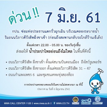 การประปานครหลวง หรือ กปน. แจ้งว่า ตั้งแต่เวลา 22.00 น. คืนนี้ (7 มิ.ย.) จนถึงเวลา 05.00 น. ของวันรุ่งขึ้น กปน. จะทำการซ่อมท่อประธานแตกรั่วฉุกเฉิน บริเวณคลองระบายน้ำริมถนนวิภาวดีรังสิตฝั่งขาเข้า (ก่อนถึงสะพานกลับรถใกล้ร้านเจ๊เล้ง) ซึ่งจะส่งผลให้น้ำประปาไหลอ่อนถึงไม่ไหลในพื้นที่ ดังนี้ - ถนนวิภาวดีรังสิต ฝั่งขาเข้า ตั้งแต่สนามบินดอนเมือง ถึงโชว์รูมพอร์ช - ถนนวิภาวดีรังสิต ฝั่งขาออก ตั้งแต่ซอยวิภาวดีรังสิต 31 - 47 - ถนนกำแพงเพชร 6 และชุมชนเคหะทุ่งสองห้อง การประปานครหลวงขออภัยในความไม่สะดวกมา ณ ทีนี้ด้วย