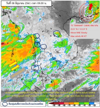 ประกาศกรมอุตุนิยมวิทยา "ฝนตกหนักถึงหนักมากบริเวณประเทศไทย และคลื่นลมแรงบริเวณภาคใต้ (มีผลกระทบในช่วงวันที่ 8-11 มิถุนายน 2561)" ฉบับที่ 2 ช่วงวันที่ 8-11 มิถุนายน บริเวณภาคเหนือ ภาคตะวันออกเฉียงเหนือ ภาคกลาง ภาคตะวันออก และภาคใต้ตอนบน จะมีฝนฟ้าคะนองเพิ่มขึ้นและมีฝนตกหนักถึงหนักมากบางแห่ง ซึ่งอาจทำให้เกิดน้ำท่วมฉับพลัน น้ำป่าไหลหลาก ขอให้ประชาชนในพื้นที่เสี่ยงภัยระวังอันตรายจากสภาวะอากาศ โดยจะมีผลกระทบตามภาคต่าง ๆ ดังนี้ ช่วงวันที่ 8-9 มิถุนายน ภาคเหนือ : เชียงราย พะเยา น่าน ลำปาง แพร่ อุตรดิตถ์ ตาก สุโขทัย กำแพงเพชร พิจิตร พิษณุโลก และเพชรบูรณ์ ภาคตะวันออกเฉียงเหนือ : หนองคาย บึงกาฬ สกลนคร นครพนม มุกดาหาร ยโสธร อำนาจเจริญ และอุบลราชธานี ภาคกลาง : นครสวรรค์ อุทัยธานี ชัยนาท สุพรรณบุรี กาญจนบุรี และราชบุรี ภาคตะวันออก : ชลบุรี ระยอง จันทบุรี และตราด ภาคใต้ : เพชรบุรี ประจวบคีรีขันธ์ ชุมพร สุราษฎร์ธานี ระนอง พังงา ภูเก็ต และกระบี่ สำหรับคลื่นลมบริเวณทะเลอันดามันและอ่าวไทยตอนบนตั้งแต่จังหวัดสุราษฎร์ธานีขึ้นมาจะมีกำลังแรง โดยมีคลื่นสูง 2-3 เมตร ชาวเรือควรเดินเรือด้วยความระมัดระวัง และเรือเล็กบริเวณทะเลอันดามันและอ่าวไทยตอนบนควรงดออกจากฝั่ง และขอให้ประชาชนบริเวณชายฝั่งของภาคตะวันออกและภาคใต้ฝั่งตะวันตก ระวังอันตรายจากคลื่นลมแรงที่พัดเข้าหาฝั่งไว้ด้วย เนื่องจากมรสุมตะวันตกเฉียงใต้กำลังแรงพัดปกคลุมทะเลอันดามัน ประเทศไทย และอ่าวไทย ทำให้ประเทศไทยมีฝนฟ้าคะนองเพิ่มมากขึ้น และมีฝนตกหนักถึงหนักมากบางแห่ง สำหรับคลื่นลมบริเวณทะเลอันดามันและอ่าวไทยตอนบนมีกำลังแรง จึงขอให้ประชาชนติดตามประกาศจากกรมอุตุนิยมวิทยาอย่างใกล้ชิด และสามารถติดตามข้อมูลที่เว็บไซต์กรมอุตุนิยมวิทยา http://www.tmd.go.th หรือสายด่วนพยากรณ์อากาศ 1182 ได้ตลอด 24 ชั่วโมง พยากรณ์ 24 ชม.ข้างหน้า ภาคใต้มีฝนฟ้าคะนอง ร้อยละ 40 ของพื้นที่ และตกหนักบางแห่ง ขณะที่ภาคอื่น กทม.ปริมณฑล มีฝนฟ้าคะนอง ร้อยละ 60 ของพื้นที่และตกหนักบางแห่ง