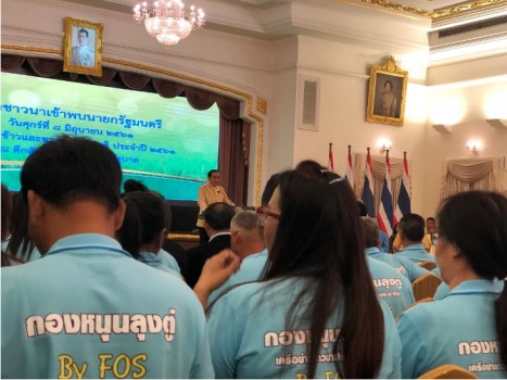 ที่ทำเนียบรัฐบาล นายกฤษฎาบุญราช รัฐมนตรีว่าการกระทรวงเกษตรและสหกรณ์ นำคณะผู้นำชาวนา องค์กรชาวนา ที่ได้รับรางวัลเกษตรกรและสถาบันเกษตรกรดีเด่น ด้านข้าว ประจำปี 2561 และตัวแทนชาวนารุ่นใหม่ เข้าเยี่ยมคารวะและรับฟังนโยบาย ด้านข้าวจาก พลเอกประยุทธ์ จันทร์โอชา นายกรัฐมนตรี และหัวหน้า คสช.เนื่องในโอกาส วันข้าวและชาวนาแห่งชาติ ทั้งนี้ คณะผู้นำชาวนา สวมเสื้อคอปกสีฟ้าสกรีน ข้อความบริเวณหน้าอกขวา ว่า ชีวิตนี้ เพื่อชาติ ศาสน์ กษัตริย์ พร้อมข้อความระบุว่า "สนับสนุนลุงตู่" และอักษรย่อภาษาอังกฤษ FOS บริเวณอกด้านซ้าย พร้อมสกรีนข้อความด้านหลังระบุ "กองหนุนลุงตู่ By FOS" ซึ่ง FOS เป็นอักษรย่อของคำว่า "Friend of Somkid" นายพูลพัชร พูลเจริญ ที่ปรึกษาสมาคมชาวนาข้าวไทย กล่าวว่า ประเด็นที่พวกเรารักนายกฯ ไม่ใช่จะเพิ่งรัก แต่รักมาตั้งแต่ปี 2546 ครั้งนั้นโดยชาวนา ได้ไปทำข้าวที่กรมทหารราบที่ 21 รักษาพระองค์ กองพันทหารเสือ ปีนั้น สมเด็จพระนางเจ้าสิริกิติ์ พระบรมราชินีนาถ ในรัชกาลที่ 9 พระราชทานเลี้ยงทุกคนที่มาเข้าเฝ้า ใส่ชุดราตรีสโมสรทั้งหมด มีพันเอกพิเศษท่านเดียวที่ลาดตระเวนตลอดพระที่นั่ง ไม่ได้กินอะไรอะไรตลอดเวลา เขาชื่อ พลเอกประยุทธ์ จันทร์โอชา ตอนนั้นเป็นรองผู้บัญชาการกองพลทหารราบที่ 21 เราประทับใจคนผู้นี้มาก เพราะจงรักภักดีต่อชาติและราชบัลลังค์ และเวลาชาวนามีปัญหาก็ให้โอกาส สนับสนุนแหล่งเงินทุน ชาวนาสามารถเข้าถึงได้ เราจึงรวมตัวกัน 5 สมาคมเป็นหนึ่งเดียว เป็นชาวนาประชารัฐ ในเมื่อเรารัก เราก็ต้องแสดงออก สำหรับตัวย่อ FOS หมายถึง Friend of Somkid ที่จัดหาแหล่งเงินทุนในเราในรูปแบบประชารัฐ พวกเรามีกันทั่วประเทศ