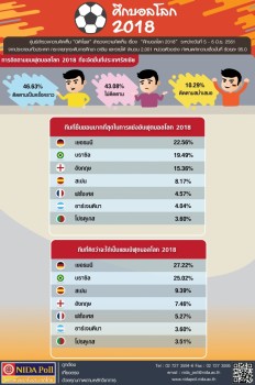 นิด้าโพล สถาบันบัณฑิตพัฒนบริหารศาสตร์ สำรวจความคิดเห็นของประชาชนเรื่อง “ศึกบอลโลก 2018” ระหว่างวันที่ 5 –6 มิ.ย.ที่ผ่านมาทั่วประเทศกระจายทุกภูมิภาค ระดับการศึกษา และอาชีพ รวม 2,001 หน่วยตัวอย่าง พบว่า ประชาชนส่วนใหญ่ ร้อยละ 46.63 ระบุว่า ติดตามชมฟุตบอลโลก 2018 เป็นครั้งคราว รองลงมา ร้อยละ 43.08 ระบุ ไม่ติดตาม และร้อยละ 10.29 ระบุ ติดตามสม่ำเสมอ สำหรับทีมฟุตบอลที่ชื่นชอบมากที่สุดในการแข่งขันฟุตบอลโลก 2018 ร้อยละ 22.56 ระบุ ทีมชาติเยอรมนี, ร้อยละ 19.49 ทีมชาติบราซิลร้อยละ 15.36 ทีมชาติอังกฤษ ร้อยละ 8.17 ทีมชาติสเปน และ ร้อยละ 4.57 ทีมชาติฝรั่งเศส ส่วนทีมที่จะได้เป็นแชมป์ฟุตบอลโลก 2018 ร้อยละ 27.22 ทีมชาติเยอรมนี, ร้อยละ 25.02 ทีมชาติบราซิล ,ร้อยละ 9.39 ทีมชาติสเปน และ ร้อยละ 7.46 ทีมชาติอังกฤษ