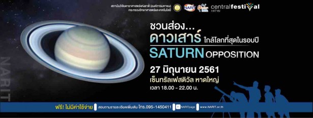สถาบันวิจัยดาราศาสตร์แห่งชาติ (องค์การมหาชน) กระทรวงวิทยาศาสตร์และเทคโนโลยี ร่วมกับศูนย์การค้าเซ็นทรัลเฟสติวัล หาดใหญ่ จัดกิจกรรม "เปิดฟ้าตามหาดาว : Saturn Opposition" วันที่ 27 มิ.ย. ตั้งแต่เวลา 18.00-21.00 น. ณ ลานหาดใหญ่ หน้าศูนย์การค้า เซ็นทรัลเฟสติวัล หาดใหญ่ จังหวัดสงขลา ขอเชิญชวนประชาชนร่วมส่องดาวเสาร์ใกล้โลก สว่าง และชัดที่สุดในรอบปี โดยจะเห็นสีเหลืองสว่างสุกใส รวมถึง "วงแหวนดาวเสาร์" และ "ดวงจันทร์ไททัน" ดวงจันทร์บริวารของดาวเสาร์ แบบเต็มตา ซึ่งได้จัดเตรียมกล้องดูดาวไว้ถึง 15 ตัว เพื่อส่องดูดาว อาทิ ดาวศุกร์ กระจุกดาวลูกไก่ เนบิวลานายพราน ดาวพฤหัส ดาวอังคาร กิจกรรมวันนั้น จะมีนิทรรศการ และบรรยายด้านดาราศาสตร์ โดยเจ้าหน้าที่หอดูดาวเฉลิม พระเกียรติ 7 รอบ พระชนมพรรษาสงขลา