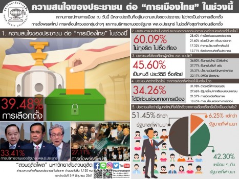“สวนดุสิตโพล” มหาวิทยาลัยสวนดุสิต สำรวจความคิดเห็นประชาชนทั่วประเทศ 1,130 คน ระหว่างวันที่ 5-9 มิถุนายน ต่อสถานการณ์ทางการเมือง ณ วันนี้ เนื่องจากมีหลายประเด็นที่อยู่ในความสนใจของประชาชน ไม่ว่าจะเป็นข่าวการเลือกตั้ง การตั้งพรรคใหม่ การเคลื่อนไหวของกลุ่มต่างๆ และการบริหารงานของรัฐบาล พล.อ.ประยุทธ์ จันทร์โอชา ในช่วงโค้งสุดท้ายก่อนเลือกตั้ง พบว่า ความสนใจของประชาชน ต่อ “การเมืองไทย” ในช่วงนี้ อันดับ 1 การเลือกตั้ง 39.48% เพราะอยากให้มีการเลือกตั้ง เป็นทางออกที่ดีให้บ้านเมือง อยากรู้ว่าจะมีเลือกตั้งจริงหรือไม่ อยากรู้วัน ที่แน่นอน อยากเห็นบ้านเมืองเป็นประชาธิปไตย รัฐบาลควรมาจากการเลือกตั้ง มาจากเสียงของประชาชน เศรษฐกิจจะได้ดีขึ้น ฯลฯ อันดับ 2 การบริหารงานของรัฐบาล พล.อ.ประยุทธ์ 33.41% เพราะมีปัญหาหลายเรื่องที่ยังแก้ไม่ได้ อยากให้ดำเนินการอย่างจริงจัง ผลงานยังไม่เข้าตา ถูกกระแสวิพากษ์วิจารณ์อย่างต่อเนื่อง ส่งผลต่อการพัฒนาประเทศและชีวิตความเป็นอยู่ของประชาชน ฯลฯ อันดับ 3 การตั้งพรรคใหม่ 27.11% เพราะ อยากรู้ข้อมูลแต่ละพรรค มีนโยบายที่น่าสนใจหรือไม่ มีใครเข้าร่วมบ้าง มีพรรคที่น่าสนใจ มีตัวเลือกหลากหลาย มีคนรุ่นใหม่เข้ามามากขึ้น มีทั้ง ส.ส. ที่ย้ายพรรคและถูกดูด ฯลฯ สำหรับบทเรียนการเมืองไทยในอดีตที่ประชาชนอยากบอกนักการเมืองที่จะสมัครเลือกตั้งในครั้งนี้ คือ อันดับ 1 ไม่ทุจริต ไม่ซื้อเสียง ไม่โกงเลือกตั้ง รู้จักแพ้ ชนะ 60.09% อันดับ 2 ขยัน ตั้งใจทำงาน ทำเพื่อส่วนรวมและประชาชน 28.40% อันดับ 3 เร่งแก้ปัญหาเศรษฐกิจ พัฒนาประเทศ สังคม และการศึกษา 21.60% อันดับ 4 ไม่โกหกหลอกลวง ต้องรักษาสัญญาและทำตามนโยบายที่หาเสียงไว้ 17.32% อันดับ 5 เคารพเสียงของคนส่วนใหญ่ รับฟังความคิดเห็นของประชาชน 13.71% ประชาชนตั้งใจจะเลือกผู้สมัคร ส.ส. แบบใด? อันดับ 1เป็นคนดี ประวัติดี ซื่อสัตย์ 45.60% อันดับ 2 เป็นคนรุ่นใหม่ มีวิสัยทัศน์ เก่ง รับฟังเสียงของประชาชน 36.80% อันดับ 3 เป็นคนในพื้นที่ ขยัน พูดจริงทำจริง ทำงานเร็ว 27.77% อันดับ 4 มีนโยบายที่เน้นแก้ปัญหาปากท้องของประชาชน 25.37% อันดับ 5 มีฝีมือ มีผลงาน มีประสบการณ์ทางการเมือง มีความรู้ความสามารถ 22.17% ประชาชนคิดว่าจะได้อะไร? จากการเลือกตั้งที่จะมีขึ้นในครั้งนี้บ้าง อันดับ 1 ได้มีส่วนร่วมทางการเมือง ออกไปใช้สิทธิเลือกตั้ง 34.26% อันดับ 2 ต่างชาติให้การยอมรับ เศรษฐกิจ การค้า การลงทุนดีขึ้น 31.98% อันดับ 3 รัฐบาลใหม่มาจากการเลือกตั้ง มาจากเสียงของประชาชน 27.66% อันดับ 4 เป็นประชาธิปไตย การเมืองมีเสถียรภาพ 21.57% อันดับ 5 เกิดการเปลี่ยนแปลงทางกา