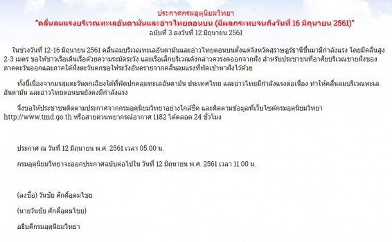 ประกาศกรมอุตุนิยมวิทยา "คลื่นลมแรงบริเวณทะเลอันดามันและอ่าวไทยตอนบน (มีผลกระทบจนถึงวันที่ 16 มิถุนายน 2561)" ฉบับที่ 3 ช่วงวันที่ 12-16 มิถุนายน คลื่นลมบริเวณทะเลอันดามันและอ่าวไทยตอนบนตั้งแต่จังหวัด สุราษฎร์ธานีขึ้นมา มีกำลังแรง โดยมีคลื่นสูง 2-3 เมตร ขอให้ชาวเรือเดินเรือด้วยความ ระมัดระวังและเรือเล็กบริเวณดังกล่าว ควรงดออกจากฝั่ง สำหรับประชาชนที่อาศัยบริเวณ ชายฝั่งของภาคตะวันออกและภาคใต้ฝั่งตะวันตก ขอให้ระวังอันตรายจากคลื่นลมแรง ที่พัดเข้าหาฝั่งไว้ด้วย ทั้งนี้ เนื่องจากมรสุมตะวันตกเฉียงใต้ ที่พัดปกคลุมทะเลอันดามัน ประเทศไทย และ อ่าวไทยมีกำลังแรงต่อเนื่อง ทำให้คลื่นลมบริเวณทะเลอันดามัน และอ่าวไทยตอนบน ยังคงมีกำลังแรง จึงขอให้ประชาชนติดตามประกาศจากกรมอุตุนิยมวิทยาอย่างใกล้ชิด และติดตามข้อมูลที่เว็บไซต์กรมอุตุนิยมวิทยา http://www.tmd.go.th หรือสายด่วน พยากรณ์อากาศ 1182 ได้ตลอด 24 ชั่วโมง