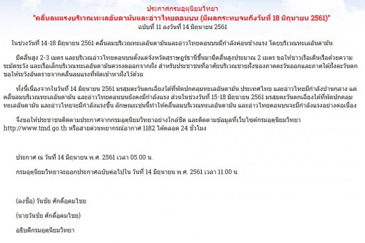 ประกาศกรมอุตุนิยมวิทยา "คลื่นลมแรงบริเวณทะเลอันดามันและอ่าวไทยตอนบน (มีผลกระทบจนถึงวันที่ 18 มิถุนายน 2561)" ฉบับที่ 11 ช่วงวันที่ 14-18 มิถุนายน คลื่นลมบริเวณทะเลอันดามันและอ่าวไทยตอนบนมีกำลัง ค่อนข้างแรง โดยบริเวณทะเลอันดามัน มีคลื่นสูง 2-3 เมตร และบริเวณอ่าวไทยตอนบน ตั้งแต่จังหวัดสุราษฎร์ธานีขึ้นมามีคลื่นสูงประมาณ 2 เมตร ขอให้ชาวเรือเดินเรือด้วยความ ระมัดระวัง และเรือเล็กบริเวณทะเลอันดามันควรงดออกจากฝั่ง สำหรับประชาชนที่อาศัย บริเวณชายฝั่งของภาคตะวันออกและภาคใต้ฝั่งตะวันตก ขอให้ระวังอันตรายจากคลื่นลมแรง ที่พัดเข้าหาฝั่งไว้ด้วย ทั้งนี้ เนื่องจากวันนี้ ( 14 มิ.ย.) มรสุมตะวันตกเฉียงใต้ที่พัดปกคลุมทะเลอันดามัน ประเทศไทย และอ่าวไทยมีกำลังปานกลาง แต่คลื่นลมบริเวณทะเลอันดามัน และอ่าวไทยตอนบน ยังคงมีกำลังแรง ส่วนในช่วงวันที่ 15-18 มิถุนายน มรสุมตะวันตกเฉียงใต้ที่พัดปกคลุม ทะเลอันดามัน และอ่าวไทยจะมีกำลังแรงขึ้น ลักษณะเช่นนี้ทำให้คลื่นลมบริเวณทะเลอันดามัน และอ่าวไทยตอนบนจะมีกำลังแรงอย่างต่อเนื่อง จึงขอให้ประชาชนติดตามประกาศจากกรมอุตุนิยมวิทยาอย่างใกล้ชิด และติดตามข้อมูล ที่เว็บไซต์กรมอุตุนิยมวิทยา http://www.tmd.go.th หรือสายด่วนพยากรณ์อากาศ 1182 ได้ตลอด 24 ชั่วโมง สำหรับพยากรณ์อากาศ 24 ชั่วโมงข้างหน้า ประเทศไทยมีปริมาณฝนลดลง แต่บริเวณภาคเหนือ ยังคงมีฝนตกมากกว่าภาคอื่นๆ ขอให้ประชาชนบริเวณดังกล่าว ที่อาศัยอยู่ใน พื้นที่เสี่ยงภัย ระวังอันตรายจากฝนที่ตกสะสมไว้ด้วย กรุงเทพมหานครและปริมณฑล มีเมฆบางส่วน กับมีฝนฟ้าคะนอง ร้อยละ 30 ของพื้นที่ ส่วนมากในช่วงระหว่างบ่ายถึงค่ำ