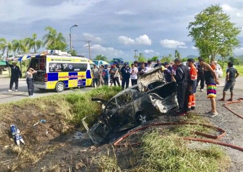 อุบัติเหตุรถเก๋งเสียหลักพลิกคว่ำไฟไหม้ เกิดบนถนนหลวงสาย 331 (สัตหีบ – เขาดิน) หน้าสถานีตำรวจภูธรห้วยใหญ่ อำเภอบางละมุง จังหวัดชลบุรี ที่เกิดเหตุพบรถเก๋งนิสสัน สีขาว ทะเบียน กธ 1912 ระยอง ชนอัดติดกับท่อระบายน้ำ สภาพพังยับเยิน ไฟไหม้ที่ห้องเครื่องยนต์อย่างรุนแรงจนลุกลามไปทั้งคัน เจ้าหน้าที่ จึงระดมฉีดน้ำดับไฟอยู่นาน 30 นาท จึงควบคุมเพลิงได้สำเร็จ ที่เบาะคนขับพบศพชาย ไม่ทราบชื่อ ถูกไฟคลอกร่างไหม้เกรียม จึงนำร่างออกมาด้านนอก นอกจากนี้ ยังมีผู้ได้รับ บาดเจ็บเป็นหญิง 1 ราย และเด็กหญิงอีก 2 ราย พลเมืองดีช่วยกันนำตัวส่งโรงพยาบาล สมเด็จพระนางเจ้าสิริกิติ์ สอบสวนทราบว่า รถคันดังกล่าวขับมา 4 คนพ่อแม่ลูก เมื่อมาถึงที่เกิดเหตุผู้เป็นพ่อ อาจจะหลับใน จึงทำให้รถเสียหลักตกร่องกลางถนน แล้วพุ่งชนท่อระบายน้ำ จนไฟ ลุกไหม้ท่วมรถ จึงมีผู้ได้รับบาดเจ็บและเสียชีวิตดังกล่าว สำหรับพลเมืองดีที่ขับรถผ่านแล้วประสบเหตุ คือนายจักรพันธุ์ ผูกดวง อายุ 23 ปี กับนายวรดร เจ๊ะมะ อายุ 36 ปี เล่าว่า เป็นคนขับรถส่งสินค้าประเภทอาหารทะเล ระหว่างทาง เห็นรถประสบอุบัติเหตุจึงลงไปช่วยเหลือ
