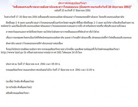 ประกาศกรมอุตุนิยมวิทยา "คลื่นลมแรงบริเวณทะเลอันดามันและอ่าวไทยตอนบน (มีผลกระทบจนถึงวันที่ 20 มิถุนายน)" ฉบับที่ 23 ช่วงวันที่ 17-20 มิถุนายน คลื่นลมบริเวณทะเลอันดามันและอ่าวไทยตอนบนมีกำลังแรง โดยบริเวณทะเลอันดามัน มีคลื่นสูง 2-4 เมตร และบริเวณอ่าวไทยตอนบนตั้งแต่ จังหวัดสุราษฎร์ธานี ขึ้นมา คลื่นสูง 2-3 เมตร ขอให้ชาวเรือเดินเรือด้วยความระมัดระวัง และเรือเล็กบริเวณทะเลอันดามันและอ่าวไทยตอนบนควรงดออกจากฝั่ง สำหรับประชาชนที่อาศัยบริเวณชายฝั่งของภาคตะวันออกและภาคใต้ฝั่งตะวันตก ขอให้ระวังอันตรายจากคลื่นลมแรงที่พัดเข้าหาฝั่งไว้ด้วย เนื่องจากมรสุมตะวันตกเฉียงใต้ที่พัดปกคลุมทะเลอันดามัน และอ่าวไทยมีกำลังแรงขึ้น ลักษณะเช่นนี้ทำให้คลื่นลมบริเวณทะเลอันดามันและอ่าวไทยตอนบนจะมีกำลังแรงอย่างต่อเนื่อง จึงขอให้ประชาชนติดตามประกาศจากกรมอุตุนิยมวิทยาอย่างใกล้ชิด และติดตามข้อมูลที่เว็บไซต์กรมอุตุนิยมวิทยา http://www.tmd.go.th หรือสายด่วนพยากรณ์อากาศ 1182 ได้ตลอด 24 ชั่วโมง พยากรณ์อากาศ 24 ชั่วโมงข้างหน้า ประเทศไทยมีฝนเพิ่มขึ้นกับมีฝนตกหนักบางแห่งบริเวณภาคเหนือ ภาคตะวันออกเฉียงเหนือ ภาคตะวันออก และภาคใต้ตอนบน ขอให้ประชาชนที่อาศัยอยู่ในพื้นที่เสี่ยงภัย ระวังอันตรายจากฝนที่ตกหนักและฝนที่ตกสะสมไว้ด้วย โดยภาคอีสาน ภาคตะวันออก ภาคใต้ กทม.ปริมณฑล มีฝน 70% ของพื้นที่และตกหนักบางแห่ง ขณะที่ภาคเหนือ ภาคกลาง มีฝน 60% ของพื้นที่