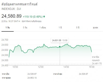 ดัชนีเฉลี่ยอุตสาหกรรมดาวโจนส์ปิดที่ 24,580.89 จุด เพิ่มขึ้น 119.19 จุด หรือ 0.49% ดัชนี S&P 500 ปิดที่ 2,754.88 จุด เพิ่มขึ้น 5.12 จุด หรือ 0.19% และดัชนี Nasdaq ปิดที่ 7,692.82 จุด ลดลง 20.14 จุด หรือ -0.26% ดัชนีดาวโจนส์ตลาดหุ้นนิวยอร์ก ปิดดีดตัวขึ้นเมื่อคืนนี้ (22 มิ.ย.) หลังจากร่วงลงติดต่อ กันมา 8 วัน เช่นเดียวกับดัชนี S&P ที่ปรับตัวขึ้นเช่นกัน โดยตลาดได้แรงหนุนจากหุ้นกลุ่ม พลังงาน ที่พุ่งขึ้นตามราคาน้ำมัน ภายหลังจากที่กลุ่มประเทศผู้ส่งออกน้ำมัน หรือ โอเปก มีมติเพิ่มกำลังการผลิตในการประชุมครั้งล่าสุด แต่ไม่ระบุปริมาณชัดเจน ซึ่งนักวิเคราะห์ มองว่าไม่น่าจะเพิ่มขึ้นมากอย่างที่ตลาดกังวลก่อนหน้านี้ อย่างไรก็ตาม ดัชนี Nasdaq ปิดแดนลบ เนื่องจากหุ้นเทคโนโลยีร่วงลง ขณะเดียวกัน นักลงทุนยังคงติดตามสถานการณ์ความตึงเครียดทางด้านการค้าระหว่าง สหรัฐและคู่ค้ารายใหญ่ อย่างจีน และสหภาพยุโรป อย่างใกล้ชิด ท่ามกลางความกังวล ว่าความขัดแย้งดังกล่าวจะลุกลามกลายเป็นปัจจัยถ่วงการขยายตัวของเศรษฐกิจทั่วโลก ขณะที่มาตรการตอบโต้ของสหภาพยุโรป หรือ EU ในการเรียกเก็บภาษีสินค้านำเข้ามูลค่า 3,200 ล้านดอลลาร์จากสหรัฐ เริ่มมีผลบังคับใช้ในวันศุกร์นี้ โดยล่าสุด ประธานาธิบดีโดนัลด์ ทรัมป์ ทวีตข้อความขู่ที่จะเรียกเก็บภาษีจากรถยนต์ ที่นำเข้าจาก EU หาก EU ไม่ยกเลิกการเรียกเก็บภาษีต่อรถยนต์สหรัฐ