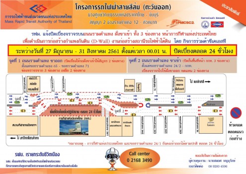 การรถไฟฟ้าขนส่งมวลชนแห่งประเทศไทย หรือ รฟม.แจ้งว่า กิจการร่วมค้าซีเคเอสที ผู้รับจ้างก่อสร้างงานโยธาอุโมงค์ทางวิ่งและสถานีใต้ดิน โครงการรถไฟฟ้าสายสีส้ม (ตะวันออก) สัญญาที่ 2 ช่วงรามคำแหง 12 – หัวหมาก มีความจำเป็นต้องเบี่ยงการจราจร บนถนนรามคำแหง หน้าการกีฬาแห่งประเทศไทย ฝั่งขาเข้า 3 ช่องจราจร เพื่อก่อสร้าง กำแพงกันดิน (D-Wall) ของสถานีรถไฟฟ้าใต้ดิน สถานีราชมังคลา ในระหว่างวันที่ 27 มิถุนายน-31 สิงหาคมนี้ ตั้งแต่งเวลา 00.01 เป็นต้นไป ตลอด 24 ชั่วโมง โดยมีผลให้ • ถนนรามคำแหง ขาเข้า ตั้งแต่ ซอยรามคำแหง 24/2 – สนามราชมังคลาฯ เบี่ยงจราจร ไปใช้ฝั่งขาออก ทดแทน 2 ช่องทาง • ถนนรามคำแหง ขาออก ตั้งแต่ซอยรามคำแหง 65 – ซอยรามคำแหง 71 ช่องจราจร จาก 3 ช่องทาง เหลือ 2 ช่องทาง ทั้งนี้ ผู้ใช้เส้นทางยังคงสัญจรเข้า – ออก บริเวณการกีฬาแห่งประเทศไทย และซอย รามคำแหง 24/1 ได้ตามปกติ แต่อาจไม่ได้รับความสะดวกในการเดินทางและอาจ มีเสียงดังรบกวนในระหว่างเนินการ ดังนั้น หากไม่มีความจำเป็น โปรดหลีกเลี่ยงเส้นทาง และ รฟม. ต้องขออภัยมา ณ โอกาสนี้