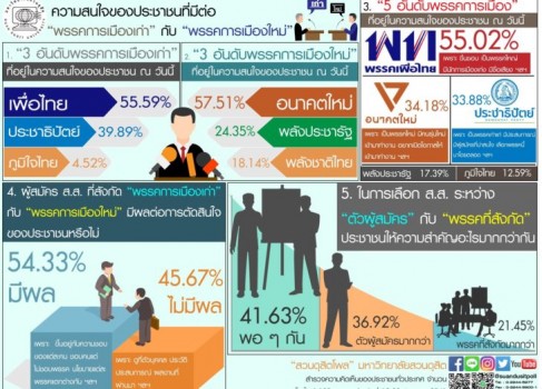 สวนดุสิตโพล มหาวิทยาลัยสวนดุสิต สำรวจความเห็นประชาชน เรื่อง ความสนใจของประชาชนที่มีต่อ พรรคการเมืองเก่ากับพรรคการเมืองใหม่ จากประชาชนทั่วประเทศ 1,105 คน ระหว่างวันที่ 19-23 มิ.ย. พบว่า อันดับพรรคการเมืองเก่า ที่อยู่ในความสนใจของประชาชน ณ วันนี้ คือ อันดับ 1 เพื่อไทย 55.59% อันดับ 2 ประชาธิปัตย์ 39.89% อันดับ 3 ภูมิใจไทย 4.52% อันดับพรรคการเมืองใหม่ ที่อยู่ในความสนใจของประชาชน ณ วันนี้ คือ อันดับ 1 อนาคตใหม่ 57.51% อันดับ 2 พลังประชารัฐ 24.35% อันดับ 3 พลังชาติไทย 18.14% เมื่อพิจารณาความสนใจในภาพรวม ทั้งพรรคการเมืองเก่า และพรรคการเมืองใหม่ 5 อันดับพรรคการเมือง ที่อยู่ในความสนใจของประชาชน ณ วันนี้ พบว่า อันดับ 1 เพื่อไทย 55.02% เพราะชื่นชอบ เป็นพรรคใหญ่ อยากให้เข้ามาแก้ไขปัญหาเศรษฐกิจ ช่วยเหลือประชาชน มีนักการเมืองเก่ง มีชื่อเสียง ฯลฯ อันดับ 2 อนาคตใหม่ 34.18% เพราะเป็นพรรคใหม่ มีคนรุ่นใหม่เข้ามาทำงาน มีนโยบายน่าสนใจ อยากเปิดโอกาสให้เข้ามาทำงาน ฯลฯ อันดับ 3 ประชาธิปัตย์ 33.88% เพราะเป็นพรรคเก่าแก่ ก่อตั้งมานาน มีประสบการณ์ ชื่นชอบการทำงาน มีผู้สมัครที่น่าสนใจ เลือกพรรคนี้มาโดยตลอด ฯลฯ อันดับ 4 พลังประชารัฐ 17.39% เพราะมีกระแสต่อเนื่อง เกี่ยวข้องกับรัฐบาลปัจจุบัน เป็นพรรคใหม่ มีนักการเมืองเข้ามาร่วมหลากหลาย ฯลฯ อันดับ 5 ภูมิใจไทย 12.59% เพราะชอบการบริหารงานที่ผ่านมา เป็นพรรคเล็กที่มีบทบาทสำคัญ ส่วนผู้สมัคร ส.ส.ที่สังกัดพรรคการเมืองเก่า พรรคการเมืองใหม่ มีผลต่อการตัดสินใจของประชาชนหรือไม่ อันดับ 1 มีผล 54.33% เพราะขึ้นอยู่กับความชอบของแต่ละคน ชอบคนแต่ไม่ชอบพรรค อันดับ 2 ไม่มีผล 45.67% เพราะดูที่ตัวบุคคล ประวัติ ประสบการณ์ ผลงานที่ผ่านมา สำหรับการเลือก ส.ส. ระหว่างตัวผู้สมัคร กับพรรคที่สังกัด ประชาชนให้ความสำคัญอะไรมากกว่ากัน อันดับ 1 พอ ๆ กัน 41.63% เพราะต้องพิจารณาทั้งตัวผู้สมัครและพรรคที่สังกัดไปพร้อม ๆ กัน อยากได้ทั้งผู้สมัครและพรรคที่ดีมีคุณภาพ หากพรรคมีนโยบายดี ก็จะส่งผลให้ผู้สมัครทำงานได้ดี มีผลงาน อันดับ 2 เลือกผู้สมัครมากกว่า 36.92% เพราะเน้นที่ตัวผู้สมัคร อยากได้คนดี ทำงานเป็น มีผลงาน คุ้นเคยกับคนในพื้นที่ อันดับ 3 เลือกพรรคที่สังกัดมากกว่า 21.45%