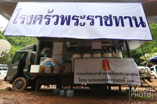 วันนี้ (30 มิ.ย.) สมเด็จพระเจ้าอยู่หัว ทรงพระกรุณาโปรดเกล้าโปรดกระหม่อมให้ พลอากาศตรี จักรพงษ์ หอมไกรลาศ ผู้ช่วยเลขาธิการสำนักพระราชวัง ลงพื้นที่ถ้ำหลวง วนอุทยานถ้ำหลวง-ขุนน้ำนางนอน อ.แม่สาย จ.เชียงราย เพื่อตรวจเยี่ยมและดูแล โรงครัวพระราชทาน ที่เป็นกำลังเสริมในการค้นหา 13 ชีวิต ที่ติดภายในถ้ำหลวง หากขาดเหลือสิ่งใดให้ดำเนินการได้ทันที ทั้งนี้ เมื่อวันที่ 28 มิถุนายนที่ผ่าน สมเด็จพระเจ้าอยู่หัว ทรงพระกรุณาโปรดเกล้าฯ พระราชทานเสื้อกันฝนจำนวน 2,000 ตัว ให้เจ้าหน้าที่ทุกคนที่ปฏิบัติภารกิจในการ ค้นหาด้วย ซึ่งเสื้อกันฝนดังกล่าว สมเด็จพระเจ้าอยู่หัว ทรงวาดภาพจากฝีพระหัตถ์ พร้อมพระราชทานข้อความว่า "รอยยิ้มกลางสายฝน"