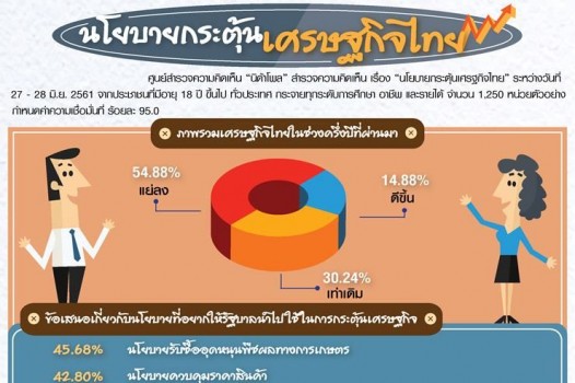 ศูนย์สำรวจความคิดเห็น “นิด้าโพล” สถาบันบัณฑิตพัฒนบริหารศาสตร์ เปิดเผยผลสำรวจความคิดเห็นประชาชน เรื่อง “นโยบายกระตุ้นเศรษฐกิจไทย” สำรวจระหว่างวันที่ 27-28มิถุนายน จากประชาชนอายุ 18 ปีขึ้นไป กระจายทุกภูมิภาค ระดับการศึกษา และอาชีพ รวม 1,250 หน่วยตัวอย่าง เกี่ยวกับนโยบายกระตุ้นเศรษฐกิจ กำหนดค่าความเชื่อมั่นที่ ร้อยละ 95 พบว่า ภาพรวมเศรษฐกิจไทยช่วงครึ่งปีที่ผ่านมา (มกราคม – มิถุนายน) ประชาชนส่วนใหญ่ ร้อยละ 54.88 ระบุ แย่ลง เพราะราคาพืชผลทางการเกษตรตกต่ำ รายได้ไม่เพียงพอรายจ่าย ขณะที่ราคาสินค้าเพิ่มสูงขึ้น รองลงมา ร้อยละ 30.24 ภาพรวมเศรษฐกิจเท่าเดิม เพราะไม่มีการเปลี่ยนแปลงเกิดขึ้นเลย ส่วนที่เห็นว่าภาพรวมเศรษฐกิจดีขึ้น มีเพียงร้อยละ 14.88 เพราะมีรายได้เพิ่มขึ้น และบางส่วนระบุว่าราคาพืชผลทางการเกษตรขยับตัวสูงขึ้น สำหรับข้อเสนอกระตุ้นเศรษฐกิจ ประชาชนส่วนใหญ่ ร้อยละ 45.68 ระบุว่า นโยบายรับซื้ออุดหนุนพืชผลทางการเกษตร รองลงมา ร้อยละ 42.80 ควบคุมราคาสินค้า ตามด้วย เพิ่มงานเพิ่มอาชีพ ลดปัญหาการว่างงาน และแรงงานนอกระบบ ลดอัตราดอกเบี้ยและคงอัตราภาษี เพิ่มค่าแรงขั้นต่ำ มอบเงินช่วยเหลือให้แก่ผู้ที่มีรายได้น้อยเพิ่มมากขึ้น ประชาชนส่วนใหญ่ ร้อยละ 56.64 ระบุว่า ไม่มีความเชื่อมั่นในการบริหารงานของรัฐบาลและมาตรการกระตุ้นเศรษฐกิจในช่วงครึ่งปีหลัง จะทำให้เศรษฐกิจไทยดีขึ้น เพราะนโยบายและโครงการกระตุ้นเศรษฐกิจของรัฐบาล ไม่ได้ช่วยประชาชนทุกระดับอย่างแท้จริง เป็นปัญหาที่แก้ไขได้ยาก รัฐบาลแก้ปัญหาไม่ตรงจุด ขณะที่ร้อยละ 38.32 เชื่อมั่น เพราะนโยบายและโครงการกระตุ้นเศรษฐกิจของรัฐบาลน่าเชื่อ บางส่วนระบุว่ามีผู้นำที่ดีและมีความเข้มแข็ง ส่วนเมื่อมีการเลือกตั้งและได้รัฐบาลชุดใหม่ จะทำให้เศรษฐกิจไทยดีขึ้นหรือไม่ พบว่า ประชาชนส่วนใหญ่ ร้อยละ 60.64 ระบุว่า เศรษฐกิจไทยจะดีขึ้น ต่างชาติจะเข้ามาลงทุนมากขึ้น เนื่องจากมั่นใจต่อรัฐบาลที่มาจากการเลือกตั้ง และน่าจะมีแนวทางในการบริหารและพัฒนาประเทศได้ดีกว่า รองลงมาร้อยละ 22.40 ระบุว่าเศรษฐกิจจะเหมือนเดิม เพราะเป็นปัญหาที่แก้ยาก ต้องใช้เวลา และต้องอาศัยปัจจัยหลาย ๆ อย่างร่วมด้วย ขณะที่บางส่วนระบุว่า ไม่ว่าจะเป็นรัฐบาลชุดไหนก็เหมือนเดิม มีเพียงร้อยละ 2 ที่ระบุ เศรษฐกิจไทยจะแย่ลง เพราะเป็นปัญหาที่แก้ไขได้ยาก และจะไม่มีความต่อเนื่องในการแก้ไขปัญหา