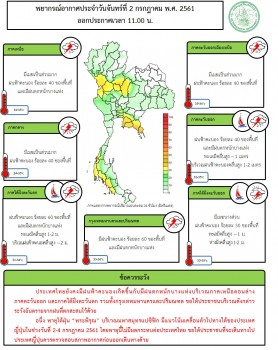 กรมอุตุนิยมวิทยา พยากรณ์อากาศ 24 ชั่วโมงข้างหน้า ประเทศไทยยังคงมีฝนฟ้าคะนอง เกิดขึ้น กับมีฝนตกหนักบางแห่งบริเวณภาคเหนือตอนล่าง ภาคตะวันออก และภาคใต้ฝั่งตะวันตก รวมทั้งกรุงเทพมหานครและปริมณฑล ขอให้ประชาชนบริเวณดังกล่าวระวังอันตรายจากฝนที่ตกสะสมไว้ด้วย อนึ่ง พายุไต้ฝุ่น “พระพิรุณ” บริเวณมหาสมุทรแปซิฟิก มีแนวโน้มเคลื่อนตัวไปทางใต้ของประเทศญี่ปุ่นในช่วงวันที่ 2-4 กรกฎาคม 2561 โดยพายุนี้ไม่มีผลกระทบต่อประเทศไทย ขอให้ประชาชนที่จะเดินทางไปประเทศญี่ปุ่นควรตรวจสอบสภาพอากาศก่อนออกเดินทางด้วย ภาคเหนือ ภาคตะวันออกเฉียงเหนือ มีฝนฟ้าคะนอง ร้อยละ 40 ของพื้นที่ โดยภาคเหนือมี ฝนตกหนักบางแห่ง บริเวณจังหวัดตาก พิจิตร กำแพงเพชร พิษณุโลก และเพชรบูรณ์ // ภาคกลาง ภาคตะวันออก มีฝนฟ้าคะนอง ร้อยละ 40 ของพื้นที่ // ภาคใต้(ฝั่งตะวันออก) มีฝนฟ้าคะนอง ร้อยละ 30 ของพื้นที่ // ภาคใต้(ฝั่งตะวันตก) และกรุงเทพฯ และปริมณฑล มีฝนฟ้าคะนอง ร้อยละ 60 ของพื้นที่