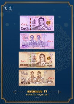 นายวิรไท สันติประภพ ผู้ว่าการธนาคารแห่งประเทศไทย หรือ ธปท. เปิดเผยว่า ธปท. ออกใช้ธนบัตรแบบใหม่ แบบ 17 ชนิดราคา 500 บาท และ 1000 บาท ในวันเฉลิม พระชนมพรรษา สมเด็จพระเจ้าอยู่หัว มหาวชิราลงกรณ บดินทรเทพยวรางกูร วันที่ 28 กรกฎาคม 2561 เพื่อใช้เป็นธนบัตรหมุนเวียนทั่วไป ด้านหน้าของธนบัตรทุกชนิดราคา เชิญพระสาทิสลักษณ์สมเด็จพระเจ้าอยู่หัวมหา- วชิราลงกรณ บดินทรเทพยวรางกูร ในฉลองพระองค์เครื่องแบบเต็มยศของกองทัพอากาศ เป็นภาพประธาน ด้านหลังของธนบัตรแต่ละชนิดราคา เชิญพระบรมสาทิสลักษณ์พระมหากษัตริย์ 2 พระองค์ เรียงตามลำดับรัชกาล พร้อมภาพประกอบที่เป็นภาพหนึ่งในพระราช กรณียกิจสำคัญของแต่ละพระองค์ โดยชนิดราคา 500 บาท แสดงพระบรมสาทิสลักษณ์พระบาทสมเด็จพระปกเกล้า เจ้าอยู่หัว คู่กับพระบาทสมเด็จพระปรเมนทรมหาอานันทมหิดล และชนิดราคา 1000 บาท แสดงพระบรมสาทิสลักษณ์พระบาทสมเด็จพระปรมินทรมหาภูมิพล อดุลยเดช คู่กับพระสาทิสลักษณ์สมเด็จพระเจ้าอยู่หัวมหาวชิราลงกรณ บดินทรเทพยวรางกูร สำหรับธนบัตรทั้ง 2 ชนิดราคานี้ ได้นำเทคโนโลยีต่อต้านการปลอมแปลงแบบพิเศษมาใช้ ดังนี้ ลายประดิษฐ์พิมพ์ด้วยเทคโนโลยีหมึกพิมพ์แม่เหล็ก 3 มิติเปลี่ยนสีได้ ทำให้เกิดลวดลาย 3 มิติเคลื่อนไหว เมื่อพลิกเปลี่ยนมุมมองและเปลี่ยนสลับจากสีทองเป็นสีเขียวได้ แถบสีที่ฝัง ในเนื้อกระดาษ จะมีบางส่วนปรากฏให้เห็นเป็นระยะ เมื่อเปลี่ยนมุมมองจะเปลี่ยนสี และ เห็นรูปเคลื่อนไหว ลายประดิษฐ์ที่เรียงกันในแนวตั้ง ใกล้กับบริเวณลายน้ำ พิมพ์ด้วย หมึกพิมพ์พิเศษสีเหลือบเหลือง สำหรับลักษณะต่อต้านการปลอมแปลงอื่น ๆ ของธนบัตร ยังคงไว้เช่นเดิม ผู้ว่า ฯ ธปท.กล่าวว่า การออกใช้ธนบัตรแบบใหม่ครั้งนี้ ธปท.ปรับปรุงข้อความเตือน ระบุโทษการปลอมหรือแปลงธนบัตรที่ด้านหลังธนบัตร ให้สอดคล้องกับพระราชบัญญัติ แก้ไขเพิ่มเติมประมวลกฎหมายอาญา พ.ศ. 2560 โดยด้านหลังของธนบัตรชนิดราคา จะมีข้อความว่า “การปลอมหรือแปลงธนบัตรเป็นความผิด ต้องระวังโทษตามประมวล กฎหมายอาญา” เพื่อให้สามารถรองรับการแก้ไขกฎหมายที่อาจเกิดขึ้นในอนาคตได้ด้วย